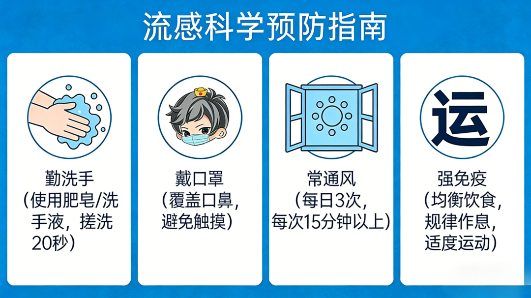 优先接种流感疫苗:这是预防流感最有效的方式。由于流感病毒易变异,疫苗成分每年都会更新,建议6月龄及以上人群每年接种一次,重点人群(老人、小孩、孕妇、慢性病患者、医务人员)优先接种,目前接种仍可产生抗体,能显著降低感染风险和重症概率;
