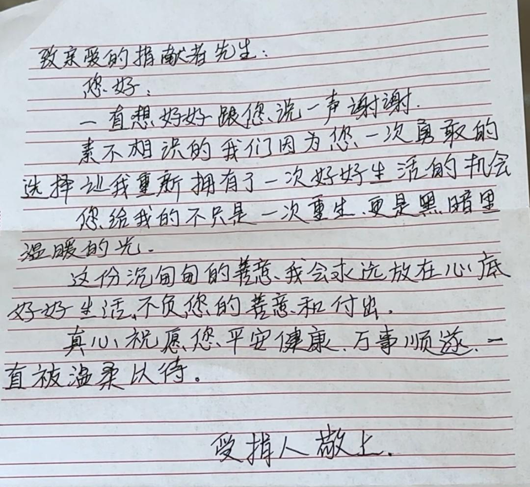 捐献当天,李冠男收到了受捐者亲手写的感谢信。当看到信里写的“您给我的不只是一次重生,更是黑暗里温暖的光”,他红了眼眶:“看他坚持到现在太不容易了,我能帮一把是一把。”