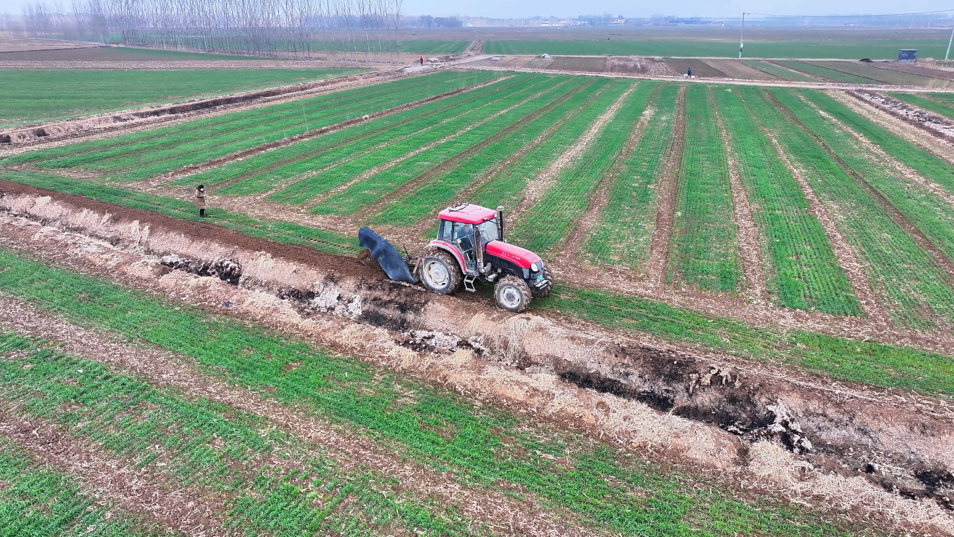 而在不远处,一架无人机正在麦田上空来回穿梭,均匀地喷洒着复壮麦苗所需的农药;田垄旁,一台开沟机缓缓推进,为铺设春灌管线开道。田间地头,机械轰鸣与人影忙碌交相辉映,构成一幅现代春耕的生动画面。