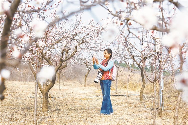 3月17日,游客在杏树下赏花游玩、打卡拍照。连日来,淄博市淄川区钟楼街道上五村杏山生态园700多亩杏树竞相开放,景色蔚为壮观,吸引了众多市民和游客前来踏青赏花、打卡拍照。记者杨忠奎胡泉通讯员翟慎安摄