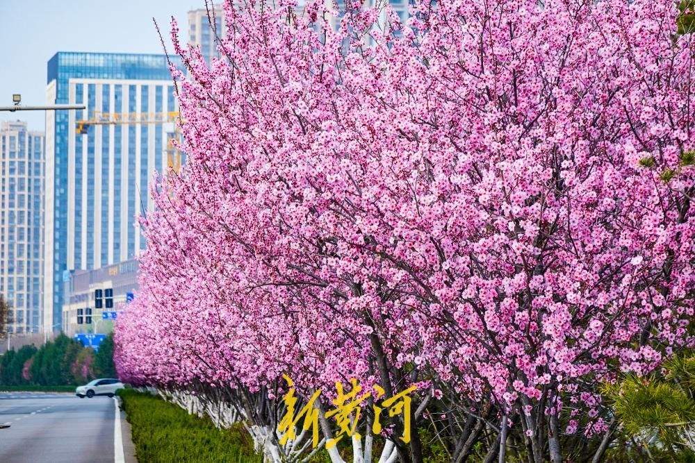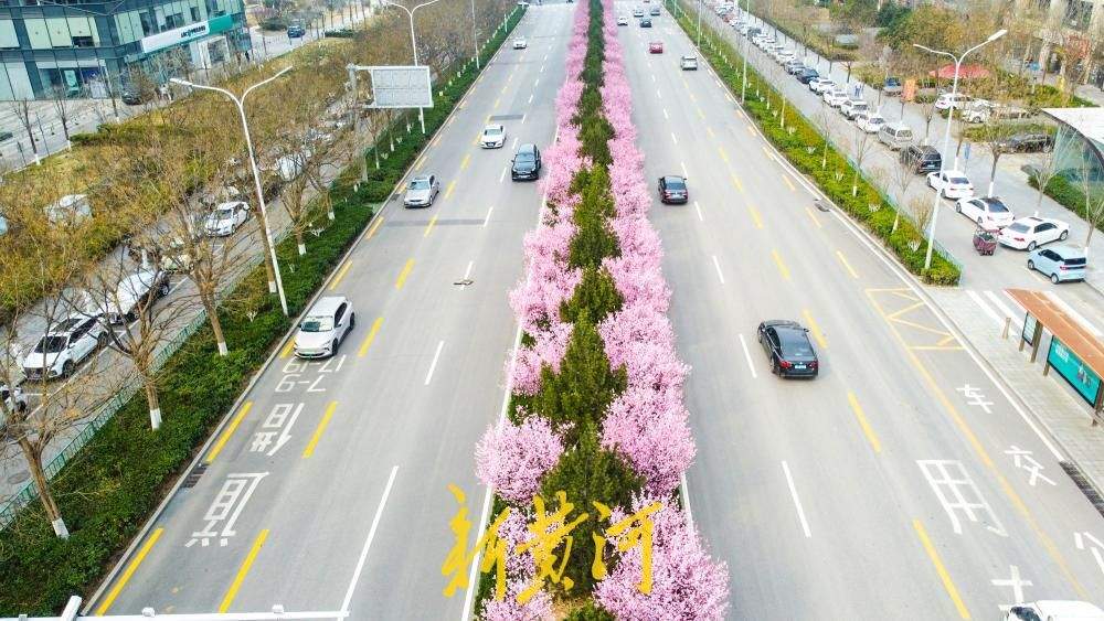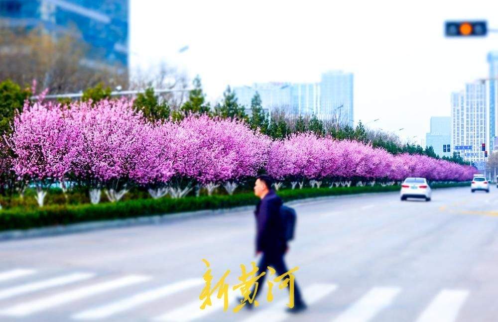 在齐鲁大道南段,成排的美人梅沿街伸展,繁花似锦,分外妖娆。过往行人纷纷放慢脚步,或驻足观赏,或举起手机记录这春日限定美景。