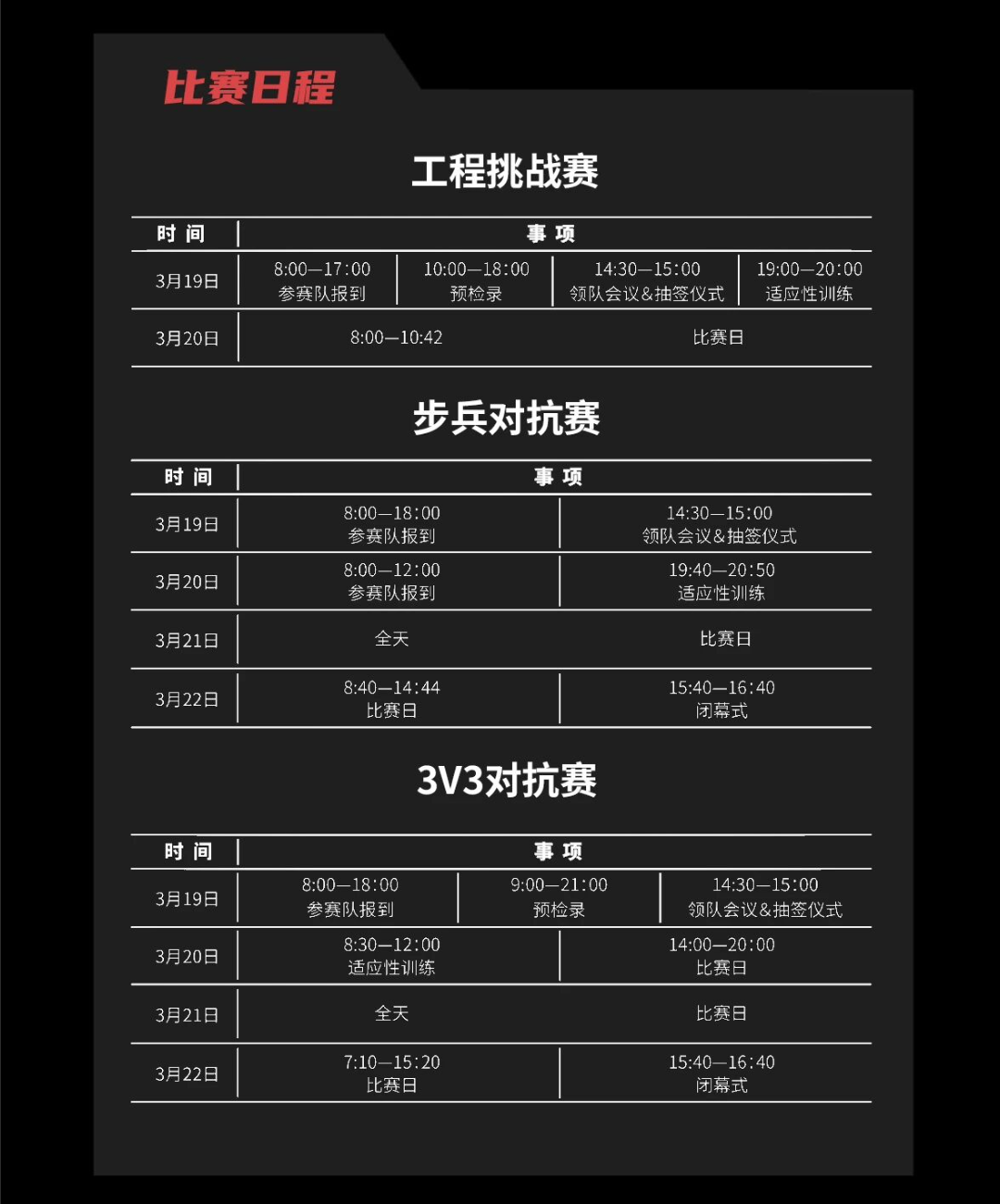 本次比赛设置3V3对抗赛、步兵对抗赛以及工程挑战赛三个赛项。其中,3V3对抗赛、步兵对抗赛由适应性训练、小组循环赛、淘汰赛、半决赛、季军争夺战和冠军争夺战构成,工程挑战赛由适应性训练和两轮正式比赛构成。