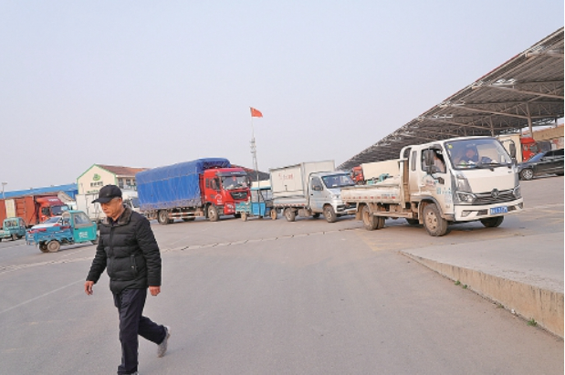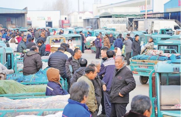 清晨天刚蒙蒙亮,数百辆电动三轮车满载黄瓜有序进入批发市场。