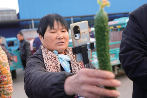 农户举着手机直播推介黄瓜,新媒体营销拓宽销售渠道,让曲堤黄瓜走向更广阔的市场。