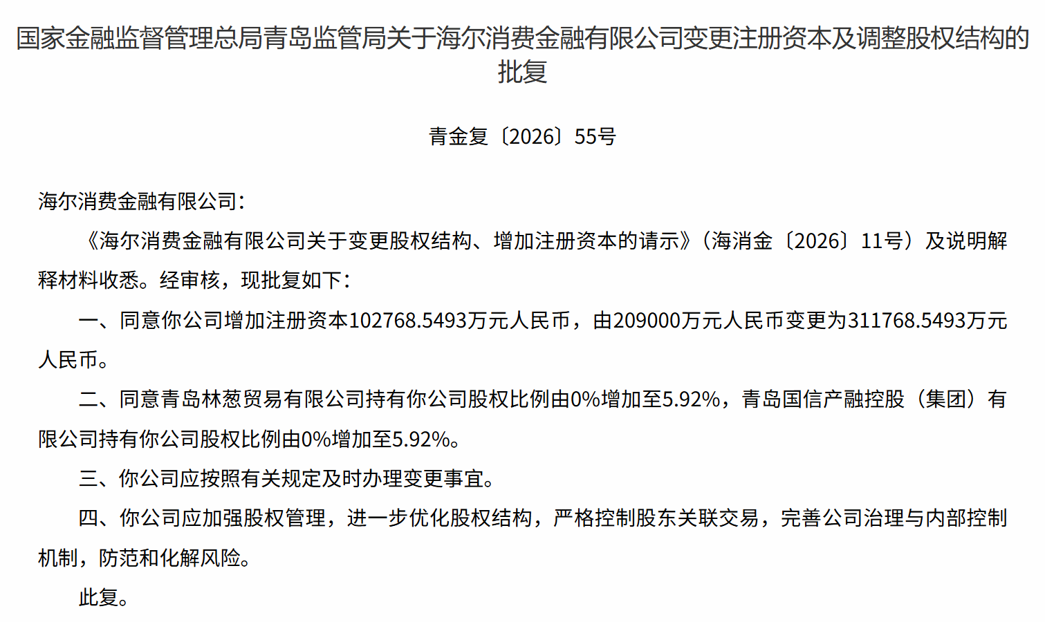 3月16日,国家金融监督管理总局青岛监管局公告,批复同意海尔消费金融有限公司(简称“海尔消金”)增加注册资本10.28亿元人民币,变更后,其注册资本由20.90亿元增加至31.18亿元。