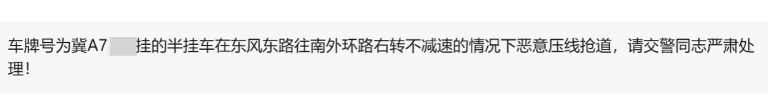 有网友举报称:在东风东路与国道513交叉口,一辆重型半挂牵引车不减速的情况下连续变更车道。接到举报后,陵城区大队立即展开调查,电话联系当事人倪某某到大队接受处理,并依法对其进行了处罚。