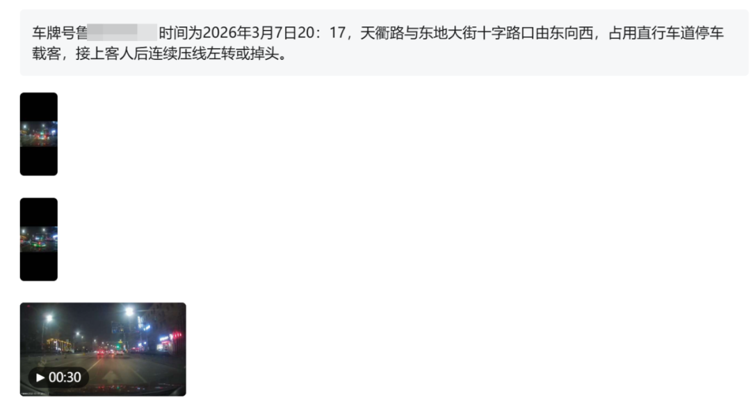 有网友举报称:鲁NT***4出租车由东向西行驶至天衢路与东地大街十字路口,存在占用直行车道停车载客、接上客人后连续压线左转或掉头的行为。