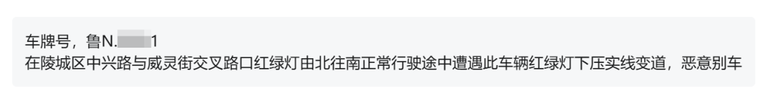 有网友举报称:在威灵街与中兴路交叉口,鲁N6***1轿车存在压实线变道、恶意别车的行为。接到举报后,陵城区大队立即展开调查,电话联系当事人沙某某到大队接受处理。