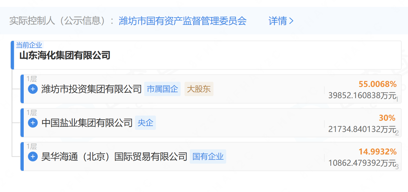 山东海化集团股权结构显示,潍坊市投资集团有限公司持有其55.0068%的股份,为公司控股股东;中国盐业集团有限公司持股30%,为第二大股东;剩余14.9932%的股权由昊华海通(北京)国际贸易有限公司持有。股权穿透,公司实际控制人为潍坊市国有资产监督管理委员会,综合持股比例为51.28%。
