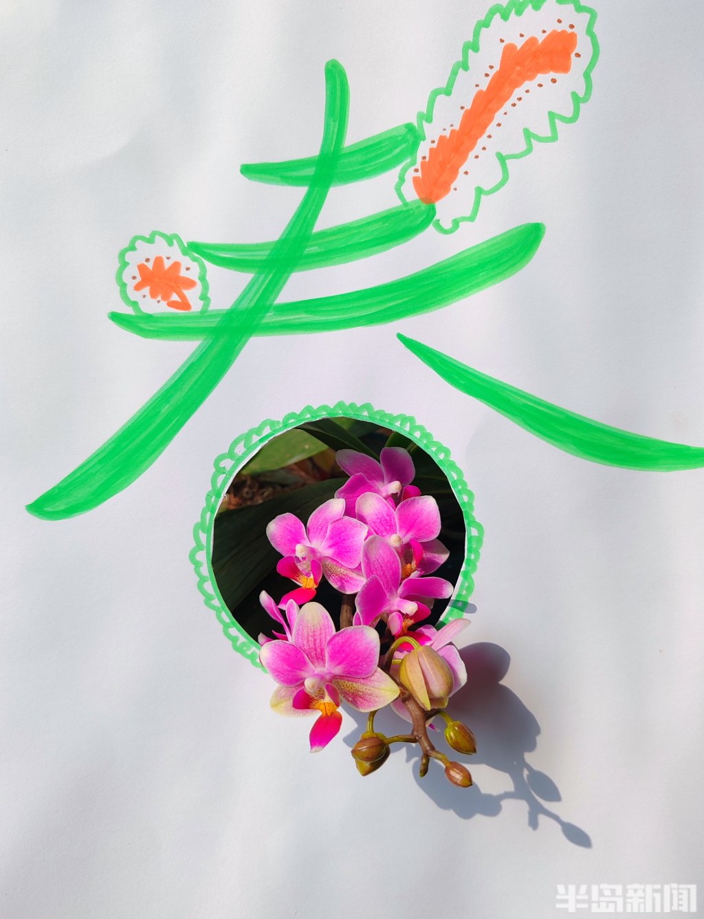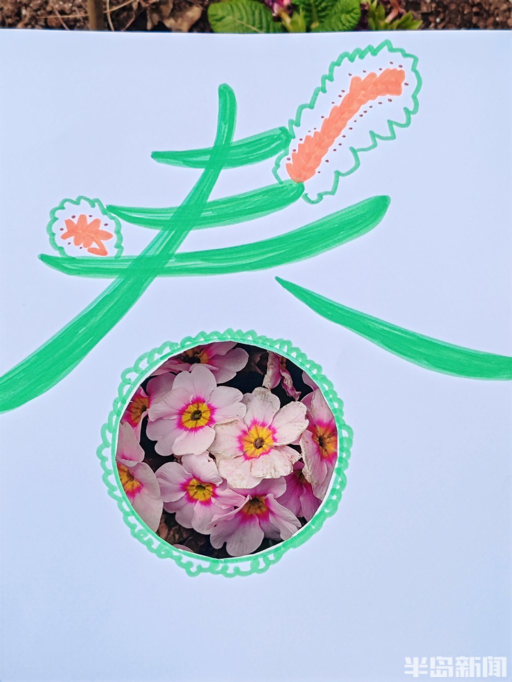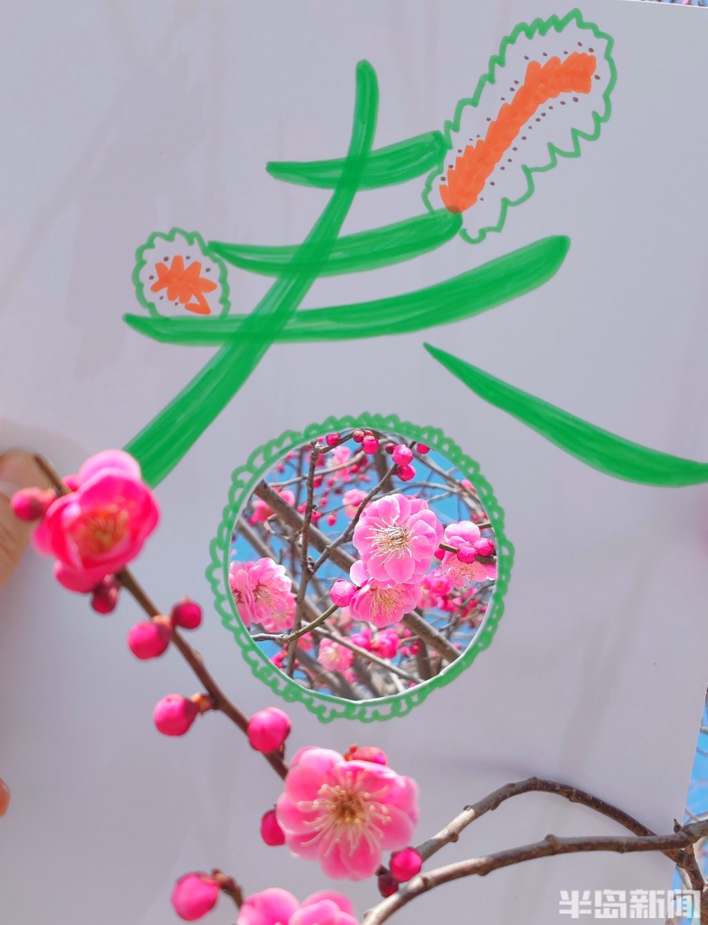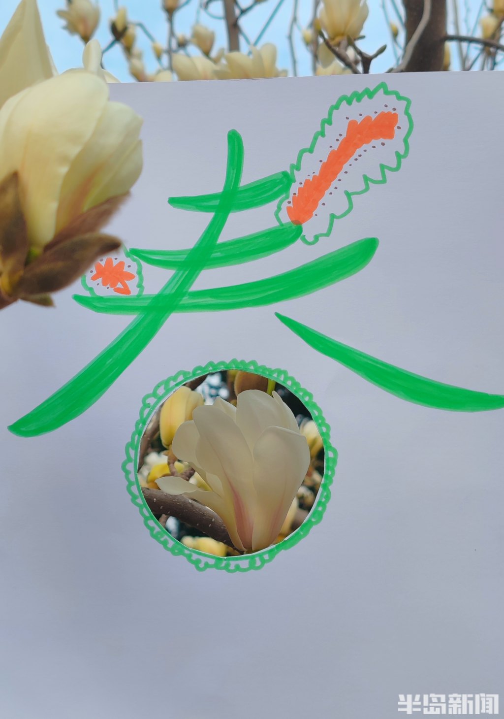 此时,正是岛城春暖花开的时节,梅花、玉兰花、迎春花等各类花卉争相绽放,公园街巷渐渐变成了花的海洋。日前,记者带着孩子,先用彩笔为“春”字涂上鲜艳的色彩,再用刻刀精心雕琢出各种生动可爱的镂空图案。当灵动的“春”字与各式镂空图案和满园繁花相映成趣,便勾勒出了另一种别具韵味的春天。