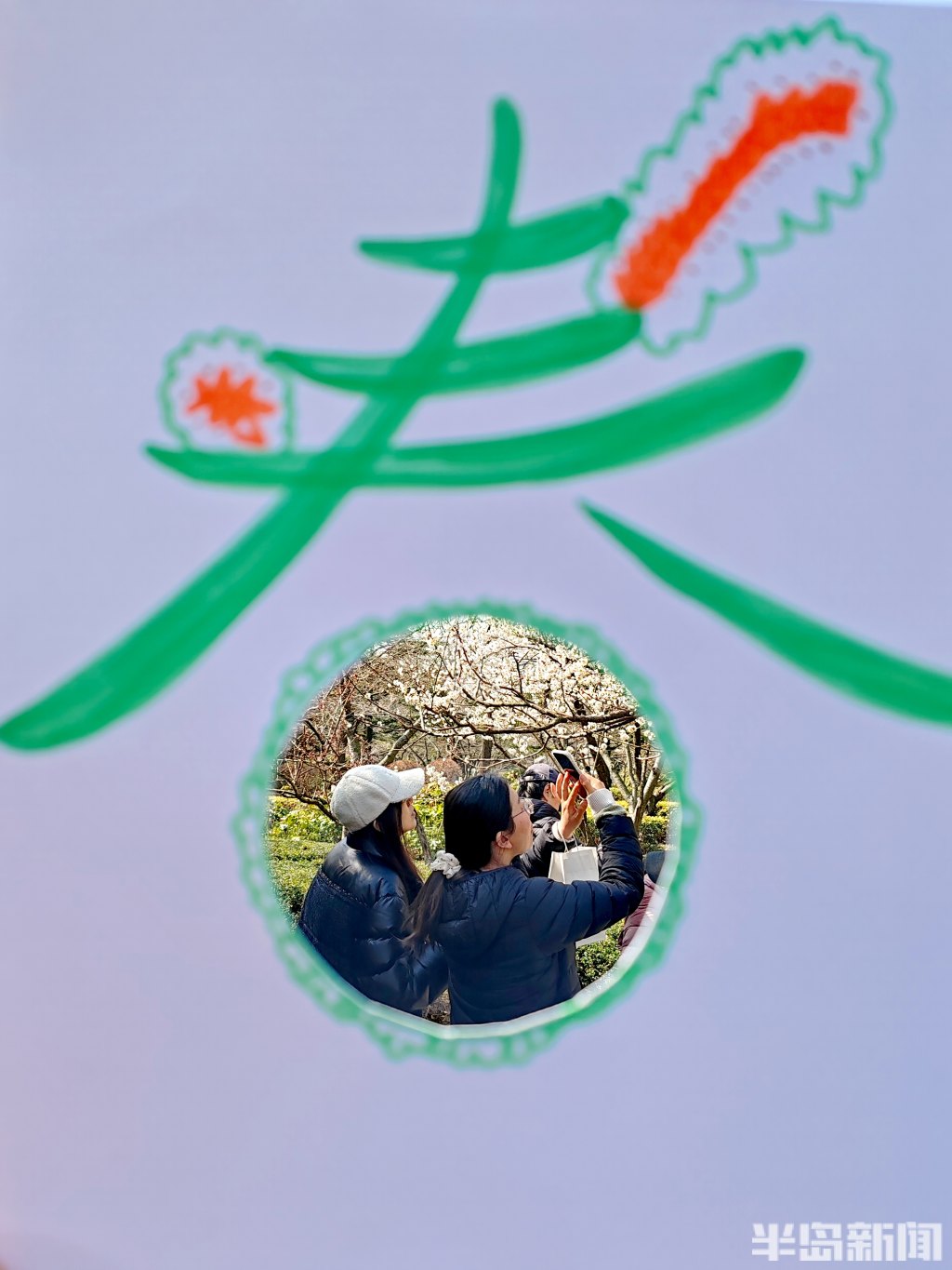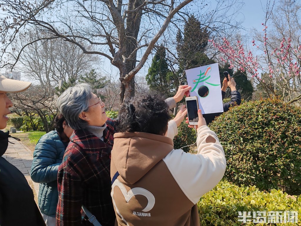 3月18日,中山公园内春意正浓,不少市民专程前来,漫步赏梅、踏青寻春。大家见到记者手中精致的镂空字与图案,纷纷好奇地借用拍照打卡留念。不少市民对这种新颖的春日记录形式十分感兴趣,直言也要用这样独特的方式,定格身边的春日美景。