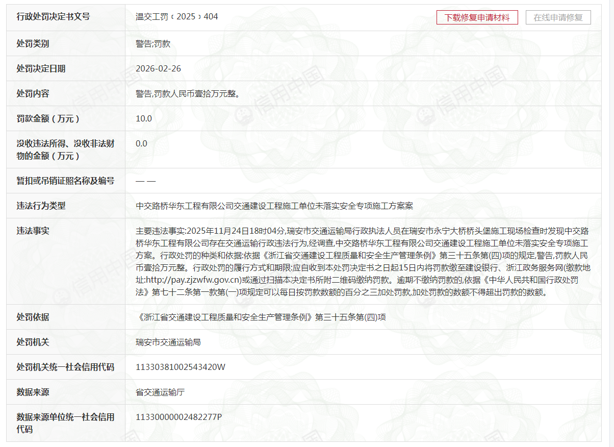 近日,信用中国公示了中交路桥华东工程有限公司的行政处罚决定。行政处罚决定书文号温交工罚﹝2025﹞404显示,2025年11月24日18时04分,瑞安市交通运输局行政执法人员在瑞安市永宁大桥桥头堡施工现场检查时发现中交路桥华东工程有限公司存在交通运输行政违法行为,经调查,中交路桥华东工程有限公司交通建设工程施工单位未落实安全专项施工方案。依据《浙江省交通建设工程质量和安全生产管理条例》第三十五条第(四)项的规定,警告,罚款人民币壹拾万元整。