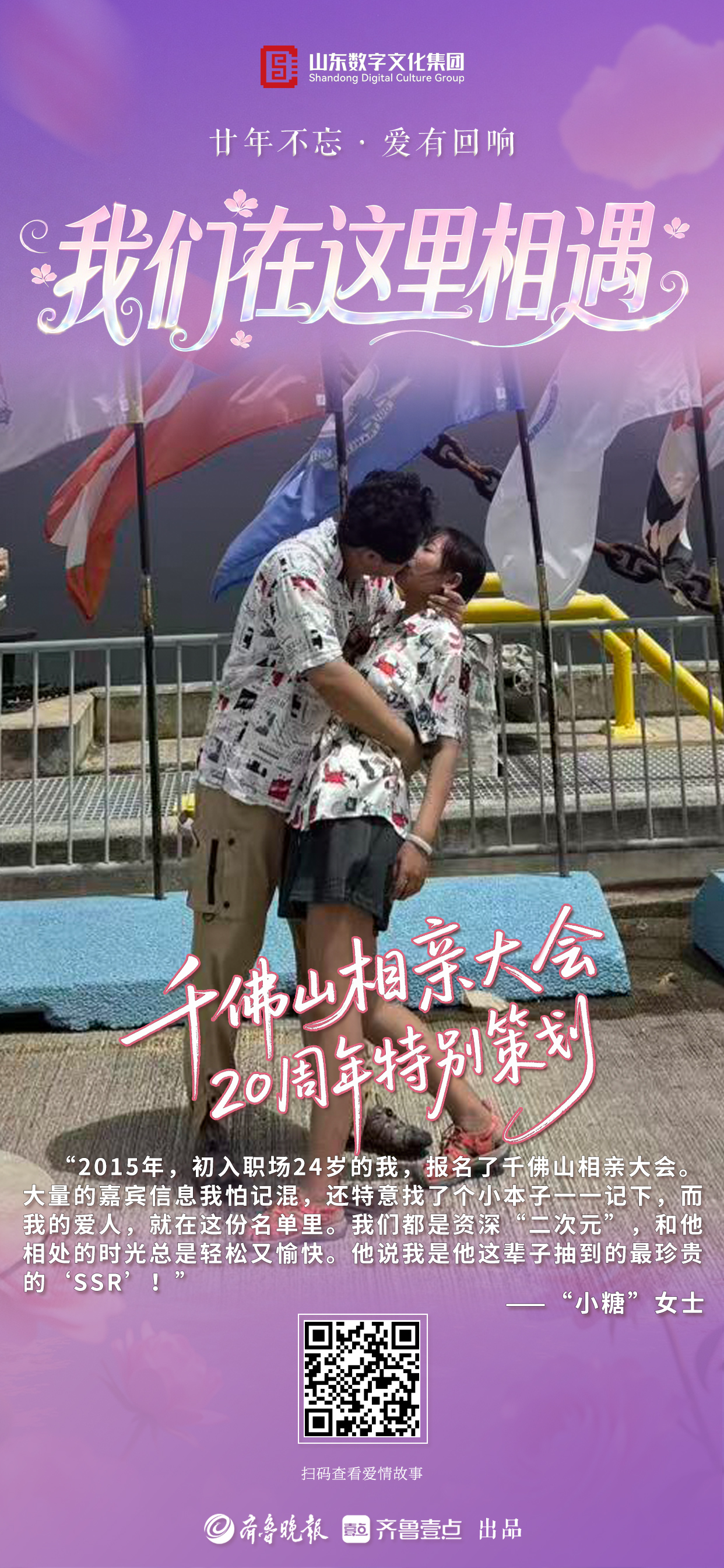 从2006到2026,二十年岁月如歌,二十年只为相遇。值此千佛山相亲大会二十周年之际,齐鲁晚报·齐鲁壹点推出“廿年不忘·爱有回响”千佛山相亲大会二十周年特别策划,向通过相亲会结缘另一半组建幸福美满家庭的无数个有缘人发出诚挚邀请,在二十周年这个特别的日子里,一起分享我们在这里相遇的故事,共忆动心时刻,共叙相守温情。