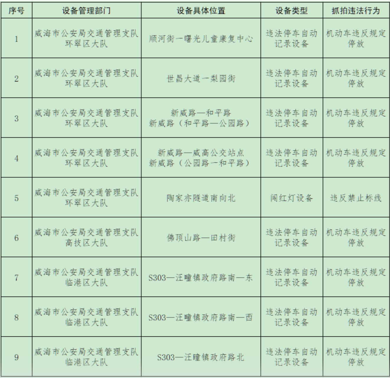 威海市公安局交通管理支队关于新增交通技术监控设备的公示