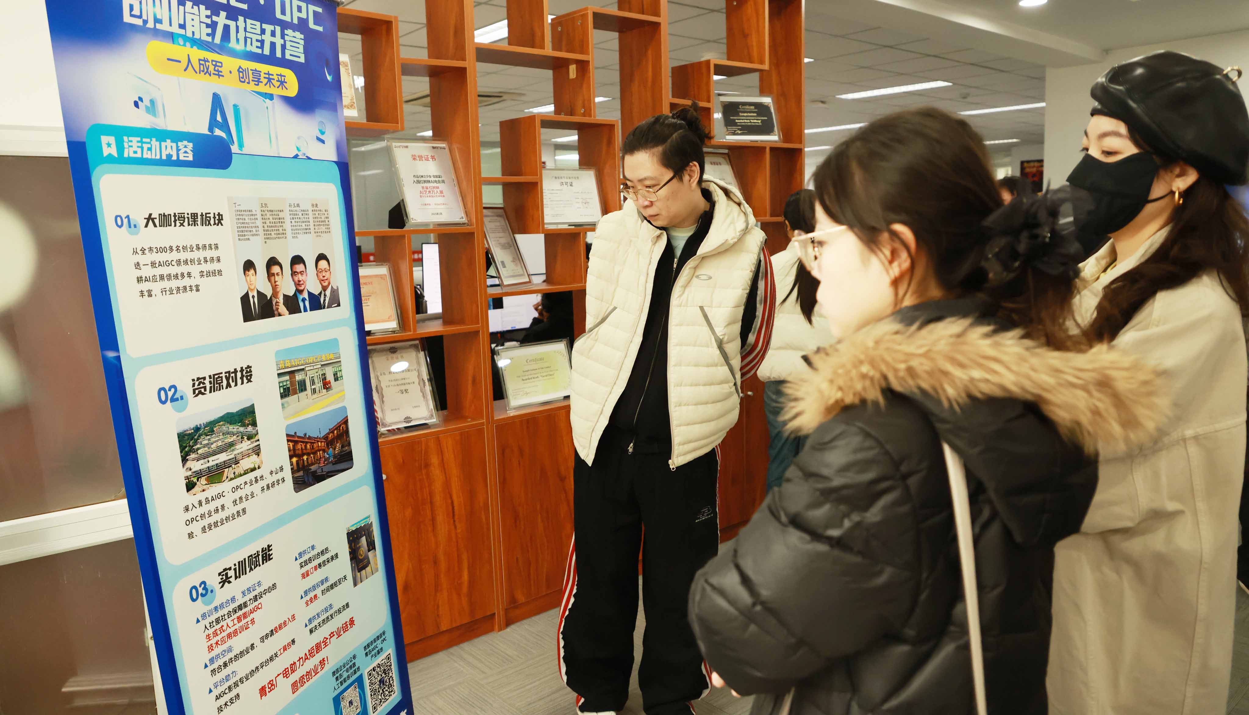 实训授课结束后,全体参训人员走进生成式人工智能(AIGC)技术应用职业培训青岛培训基地,开展实地研学参观。在基地 AIGC・OPC政策咨询区,工作人员面对面为创业者详细解读各项创业扶持政策,精准解答政策申报等方面的疑问;在AI漫剧内容制作全流程展示区,学员们近距离观摩剧本创作、分镜设计、AIGC工具流应用及后期制作的完整产业链条,直观感受AIGC技术对内容产业发展带来的颠覆性变革与创新机遇。此次沉浸式的研学体验,不仅让创业者熟练掌握了AIGC前沿工具的实操方法,更让“一人成军”的新型创业模式变得具象可感,为创业者将 AIGC 技术转化为创业实践能力奠定了坚实基础。