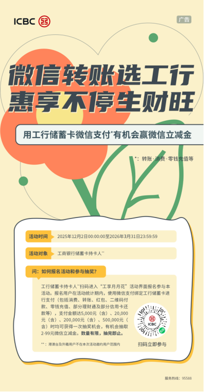 3月31日前用户可通过扫描活动二维码参与本活动,报名用户在活动统计期内,使用微信支付绑定工商银行储蓄卡进行支付(含转账、红包、二维码付款、零钱充值、部分信用卡还款、部分理财通、消费等),每月支付金额达标后可参与微信立减金抽奖,最高可抽396元立减金,数量有限,先到先得。