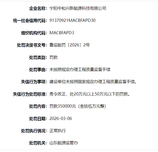 近日,山东能源监管办对宁阳中和兴新能源科技有限公司失信行为进行了处罚,处罚金额35万元。 本次处罚事由是建设单位未按照国家规定办理工程质量监督手续。这种失信行为处罚的标准是20万元以上50万元以下,最终该公司被处罚35万元,并且责令改正。(来源:国家能源局)