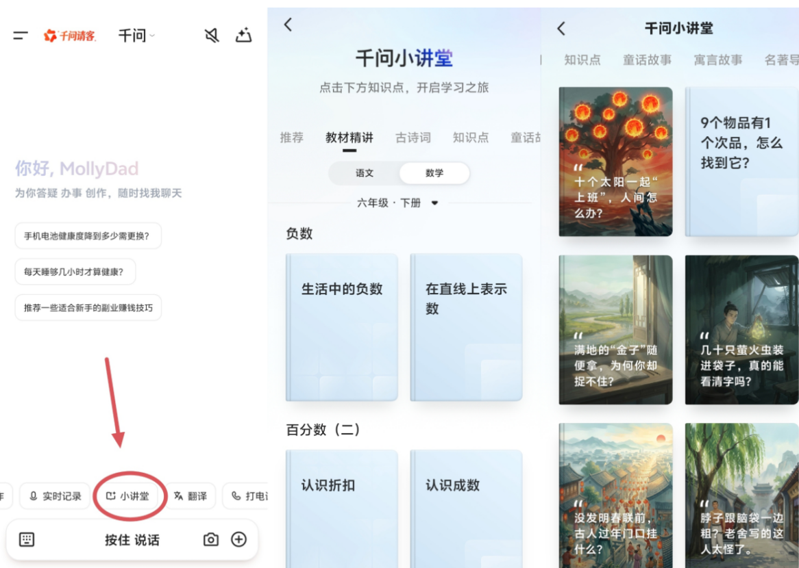 此次升级聚焦三大场景。一是“新课入门难”,千问APP上线“小讲堂”AI讲教材功能。首批覆盖小学一到六年级语文、数学教材,并支持童话、寓言、名著等读物的互动式趣味讲解。通过语音讲解、动态图示与引导式问答,将抽象知识点转化为生动易懂的内容,帮助学生快速建立学习兴趣与理解基础。