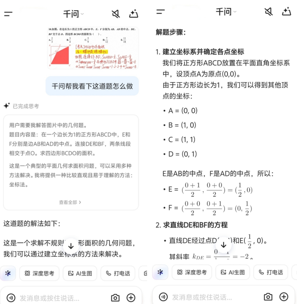 二是“解题没思路”,千问升级“拍题答疑”功能。不仅能准确地识别带图片的各类难题,更能像经验丰富的老师一样拆思路、讲方法。相比于直接给答案,千问更强调讲解过程,把解题思路一步步展现出来,真正在做题中掌握知识点和方法。