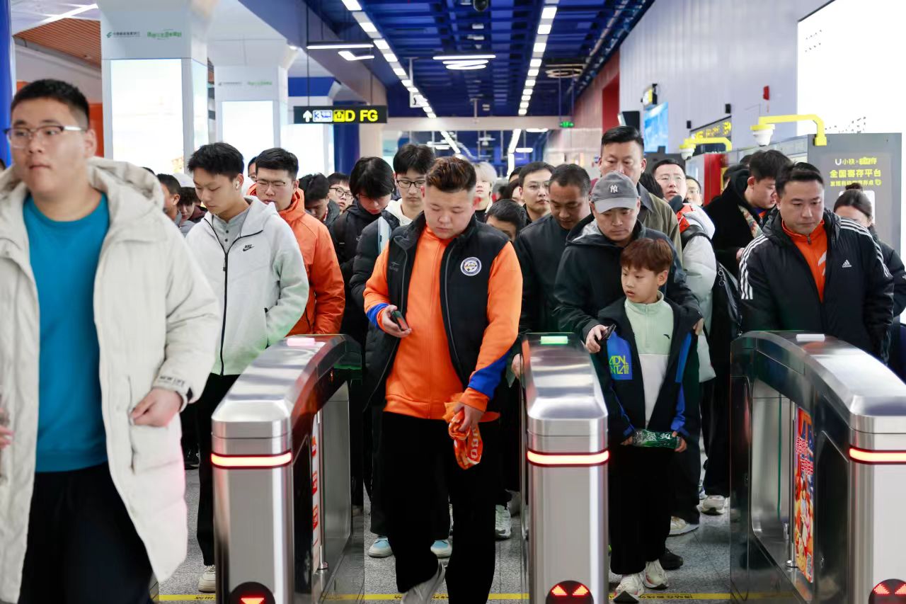 赛事的火爆,最直观地体现在客流数据的飙升上。据统计,在3月14日中超比赛当日,作为4号线与3号线换乘枢纽的奥体中心站,客流较2月7日(非赛事常规周末)环比激增了482%。而相较于2025年8月31日中超山东泰山主场对阵北京国安,比赛散场进站客流增幅达到409%。