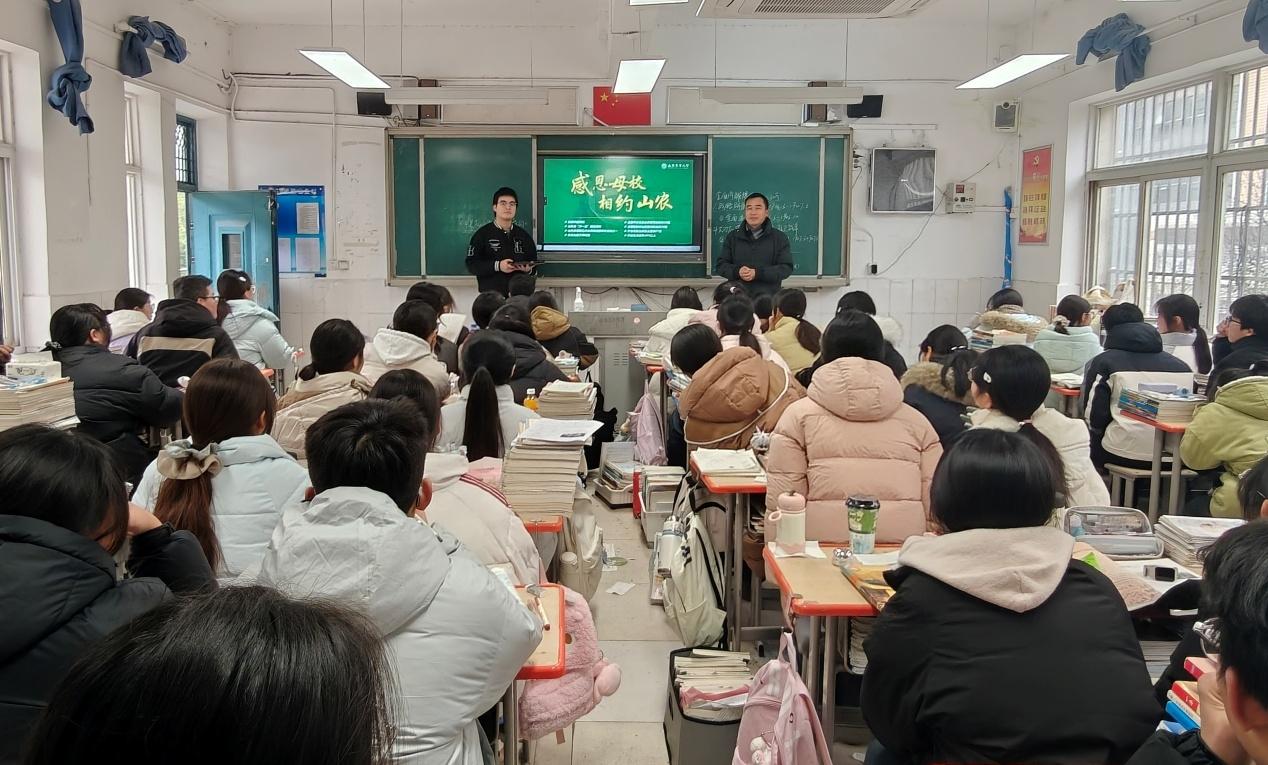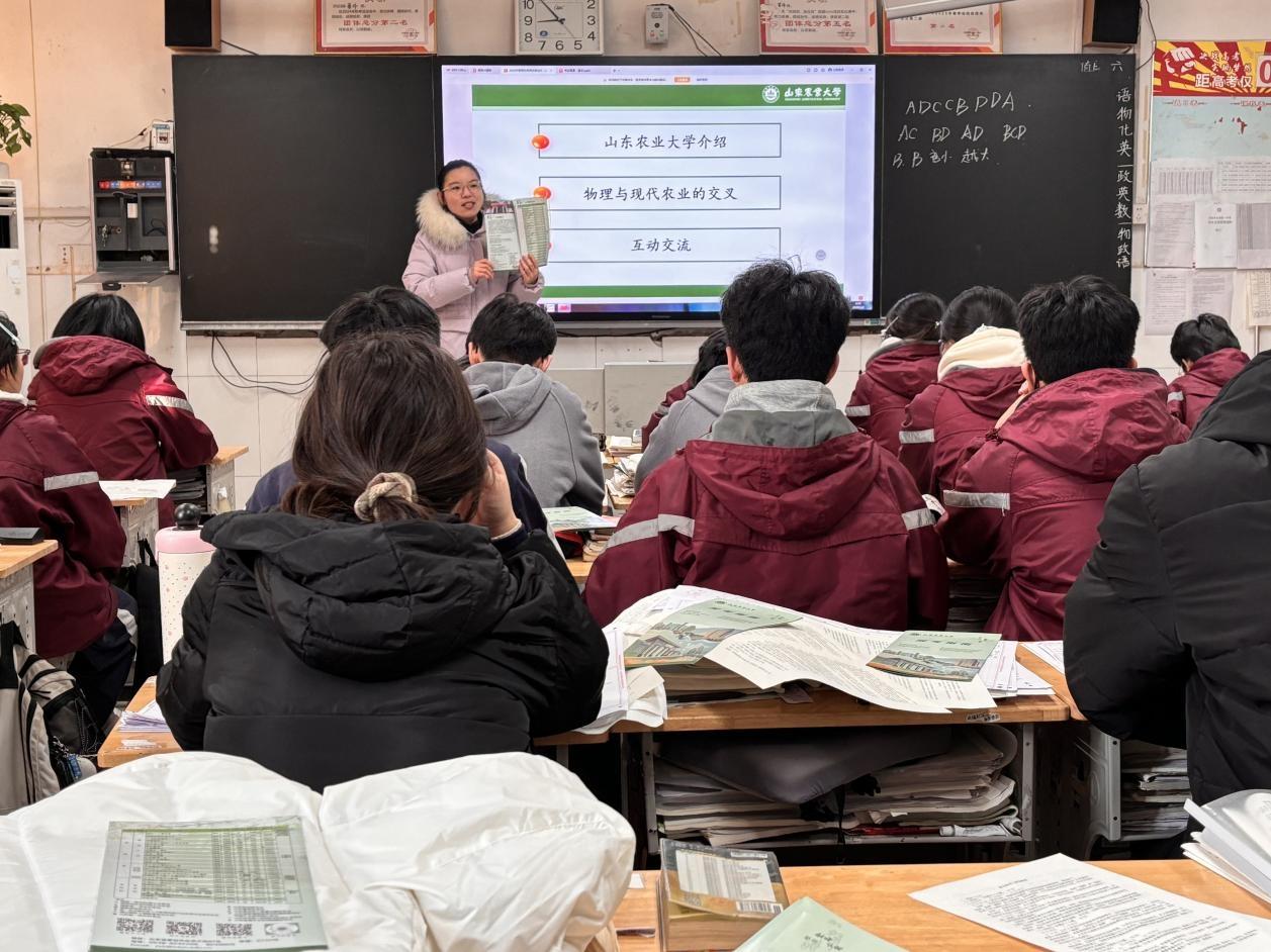 这个寒假,这样的温暖与精彩在全国各地的高中校园里不断上演。在潍坊一中,赵钰潇等农大学子以“高中校友+山农学子”的双重身份,解答备考疑问,讲解山农的学科优势与科研实力,讲述“科技赋能农业”“产业振兴实践”的生动故事;在湖北鄂州高中,熊蕊等农大学子分工协作,通过播放宣传视频、PPT讲解、一对一交流等形式,把山农的校园魅力与育人成果娓娓道来。