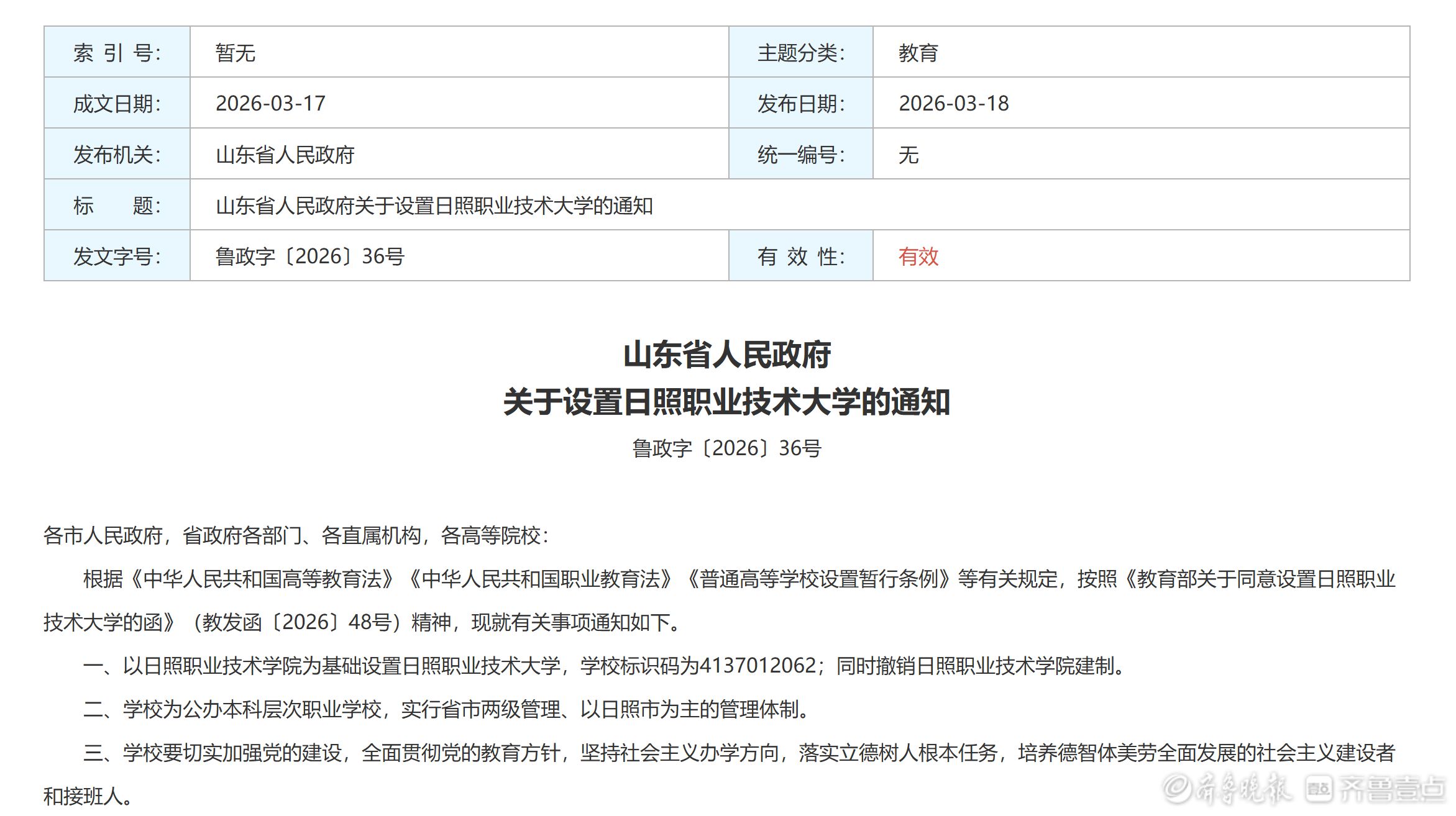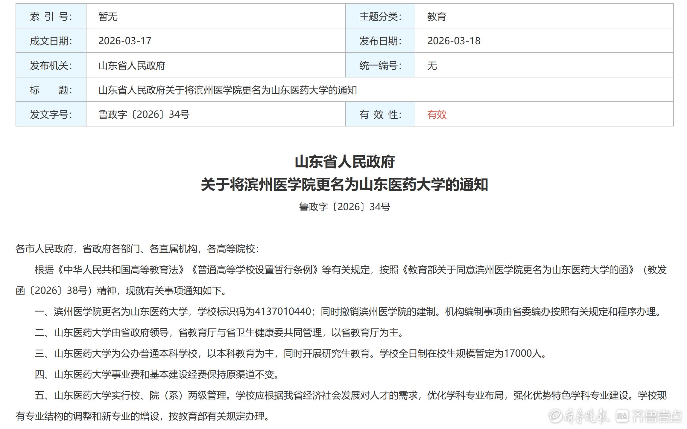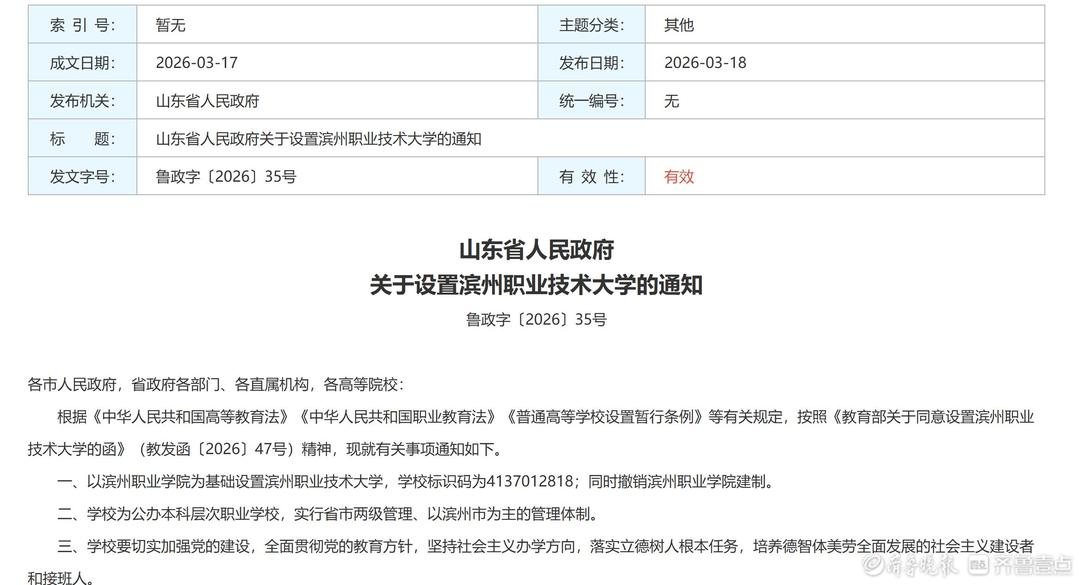 3月18日,山东省人民政府公开发布鲁政字〔2026〕34号、35号、36号文件,正式批复滨州医学院更名为山东医药大学,同时同意以滨州职业学院为基础设置滨州职业技术大学、以日照职业技术学院为基础设置日照职业技术大学。山东高等教育布局再迎重要调整,医药类高校与本科层次职业教育同步扩容。