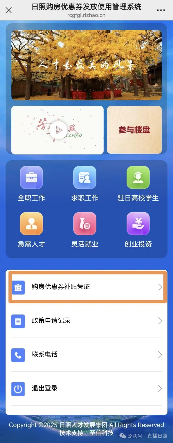 (2)关注“日照市住建局”或“日照人才发展集团”公众号,在公众号主页点击“才易居”菜单栏进入。