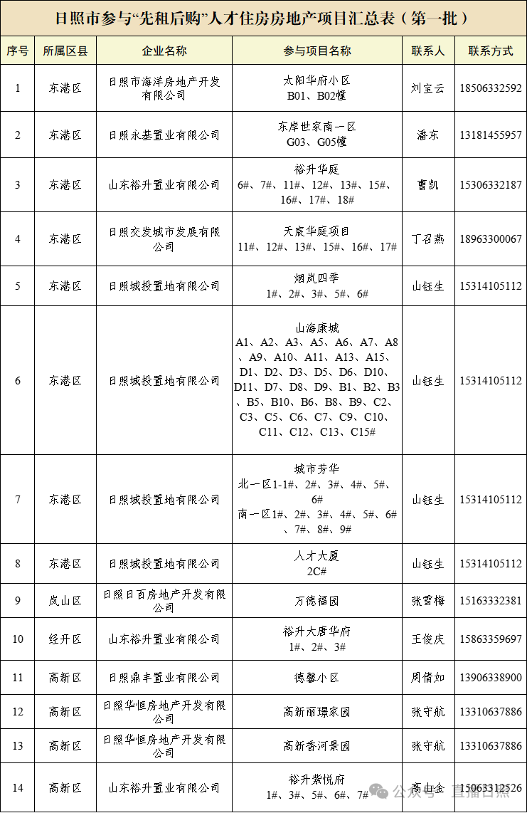根据市委组织部、市住建局等8部门《日照市“先租后购”人才住房暂行办法》文件精神,政策期内(2026年2月28日至2029年2月27日),在我市工作的各类人才、到日照求职的青年人才及驻日照高校在校学生,购买“先租后购”人才住房房源库内商品住房时,可使用购房前实际产生租金折扣房款。经房地产开发企业提出申请,各区县、功能区住建部门审查,市住房城乡建设局备案,以下项目被纳入“先租后购”人才住房房源库,具体名单如下: