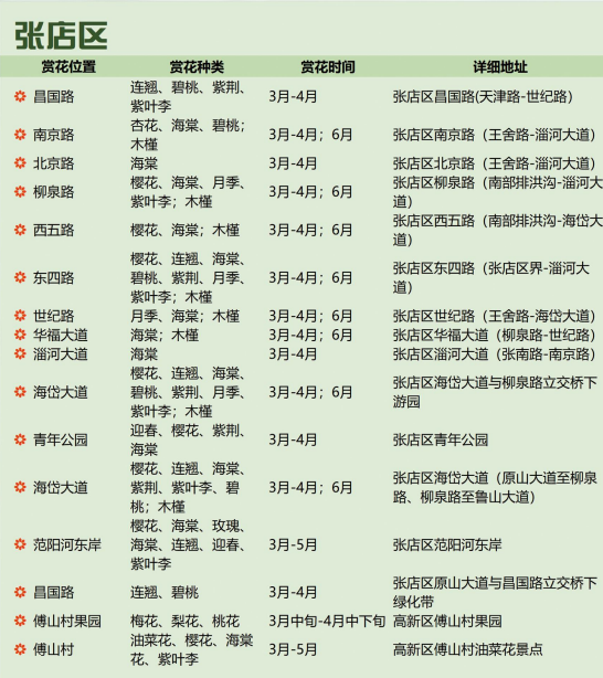 📍赏花推荐地:张店区儿童公园、重庆路(人民路以北)、西五路、新村西路;淄川区南部森林公园、张博路附线(将军路路口);博山区三水源生态旅游度假区。