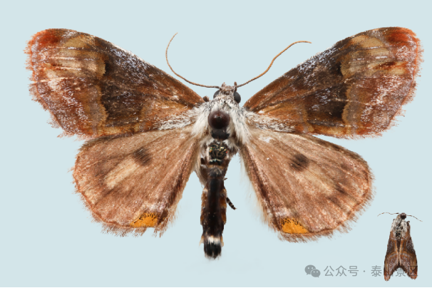 尺圆夜蛾翅展不到2厘米,头和胸部灰白色,翅膀却装扮的花里胡哨:红褐色打底,中间一条散布白色鳞片的黑褐色宽带,翅基和翅缘还点缀着银白色鳞;后翅颜色较浅,中部有个暗色圆斑,臀角处还有一块小黄斑。它的腹部也很有特点,第2、3节背面的鳞片簇居然反射布灵布灵的光泽。最搞笑的是它的“躺平姿势”。歇息时,前足往前一伸,翅往腹背面一收,整只蛾瞬间化身为一坨色彩斑驳的鸟粪。这是为啥?当然是为了活命呀,毕竟谁会对一坨鸟粪感兴趣呢?凭借这项绝技,尺圆夜蛾在泰山过得相当滋润。