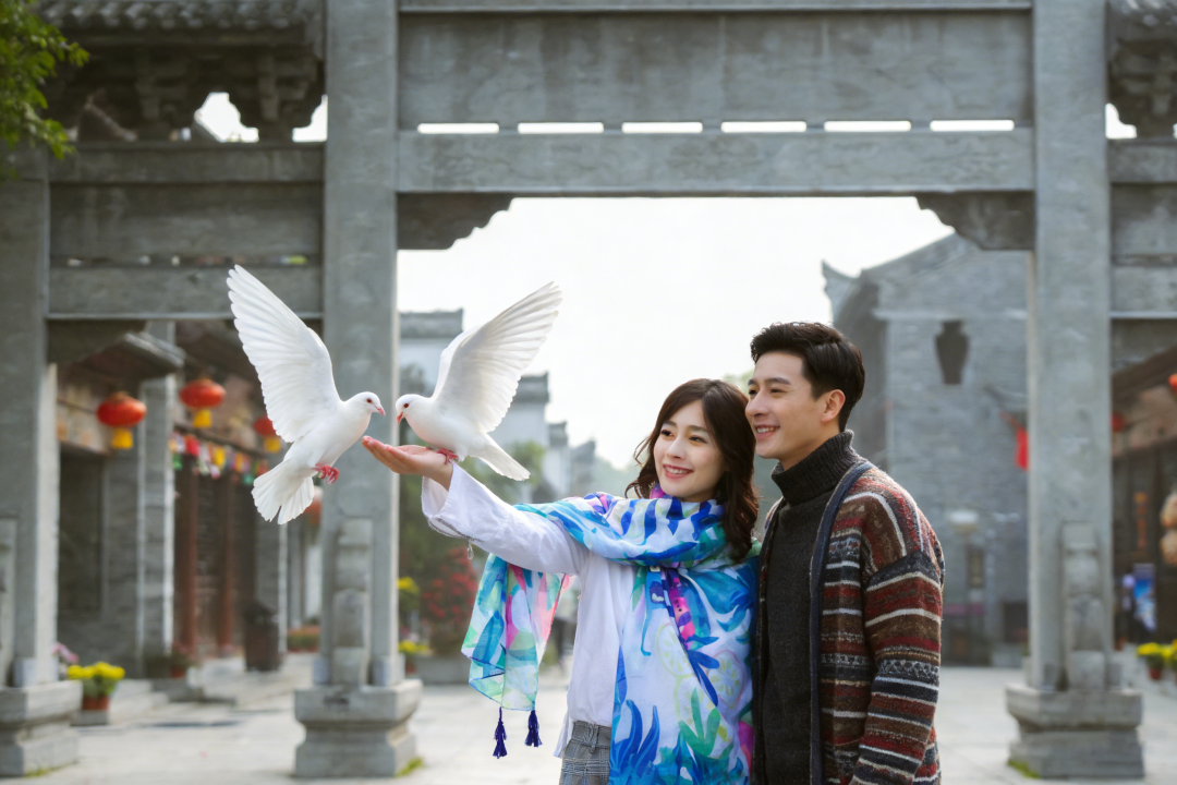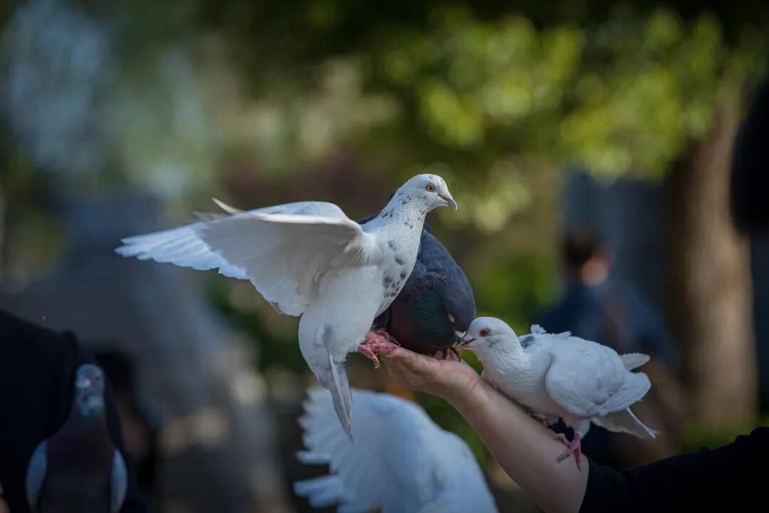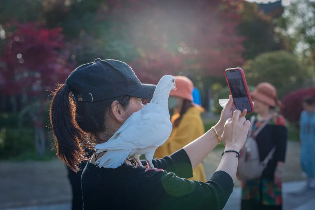 小tips:穿深色衣服更出片,白鸽落在肩头时,对比度刚刚好。