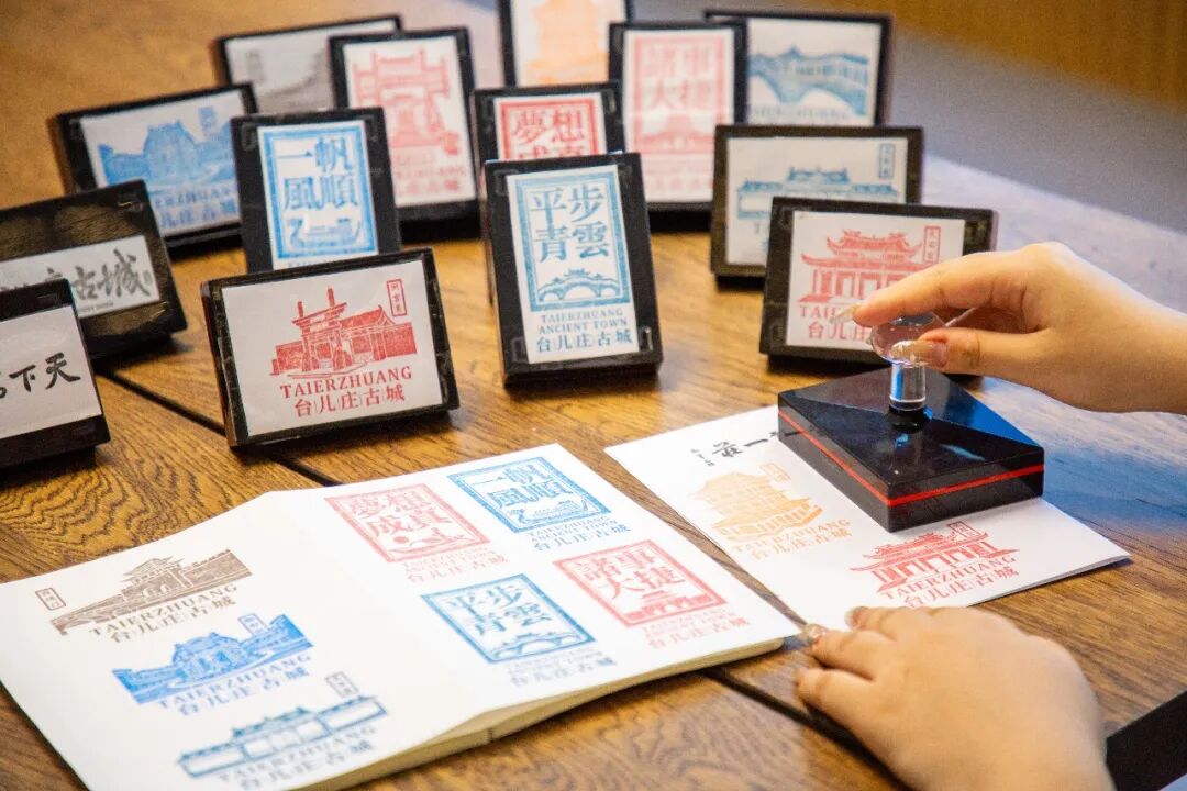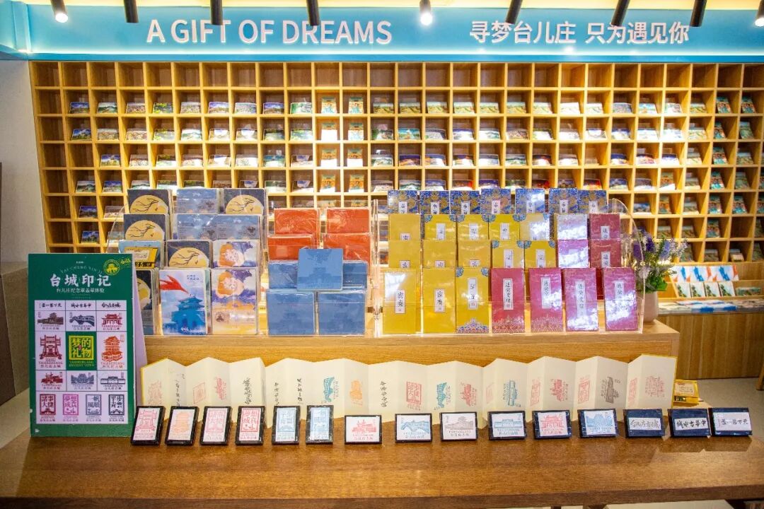 梦的礼物文创店里,印章本是台儿庄的另一种语言。拱形石桥、马头墙、柳琴戏台、大战弹孔——每一枚都藏着故事的纹路。买一本空白折页,从东门盖到西门,集齐的过程就是重走一遍古城。