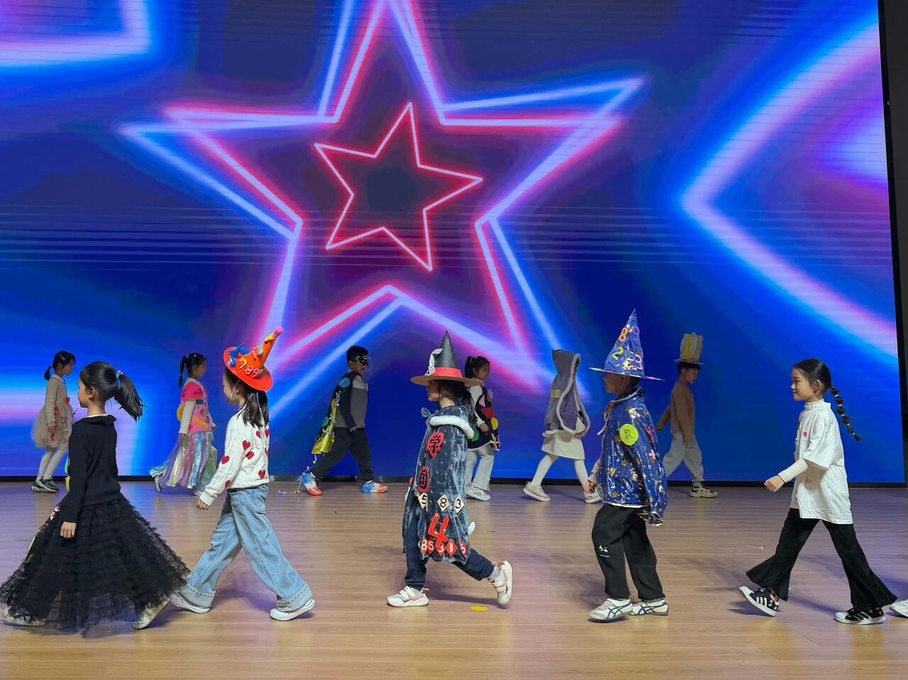 一年级同步开展图形创意时装秀,学子们以圆形、方形、三角形等简单几何图形为灵感,用朴素材料设计时装,小模特们昂首挺胸、自信展示,充分展现了纯粹的想象力与创造力。二年级学子带来手势舞《我爱数学》,伴着轻快旋律,用整齐灵动的手势融合数字与节奏,稚嫩的脸庞满是认真,既展现了积极向上的风貌,也传递出对数学的喜爱。