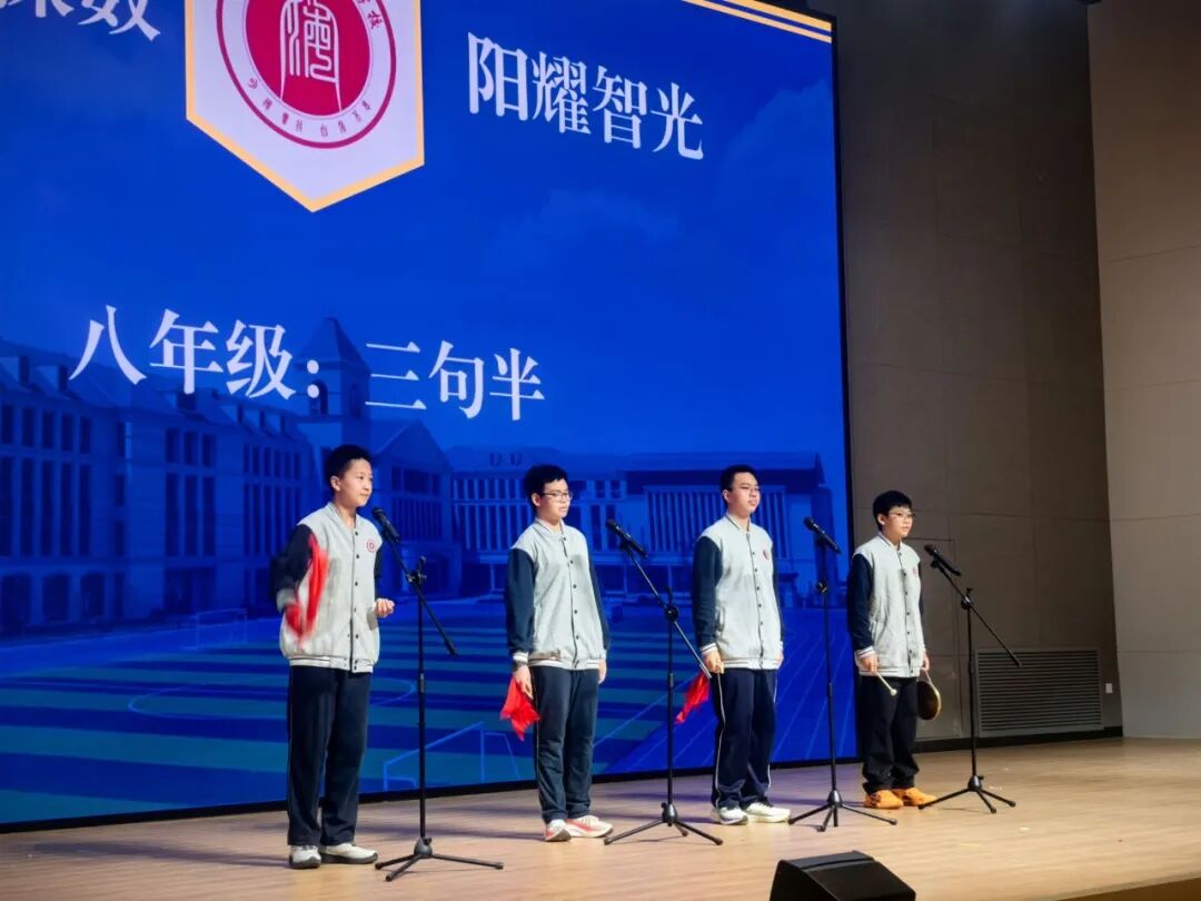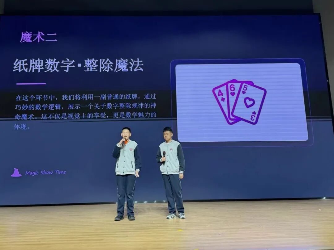 七年级学子展示的数学魔术表演极具亮点,通过心灵读心术、纸牌整除、1089数位奇迹、生日猜谜等趣味形式,无需复杂道具,用运算玩转数学魔法,让抽象的数学公式变得生动可感,让现场师生在互动中感受数学魅力。八年级学子则将整式分式运算、一次函数、几何证明、勾股定理等重点难点,编成朗朗上口的演绎内容,以诙谐的语言、整齐的节奏,让大家在欢笑中感受数学的智慧与乐趣。