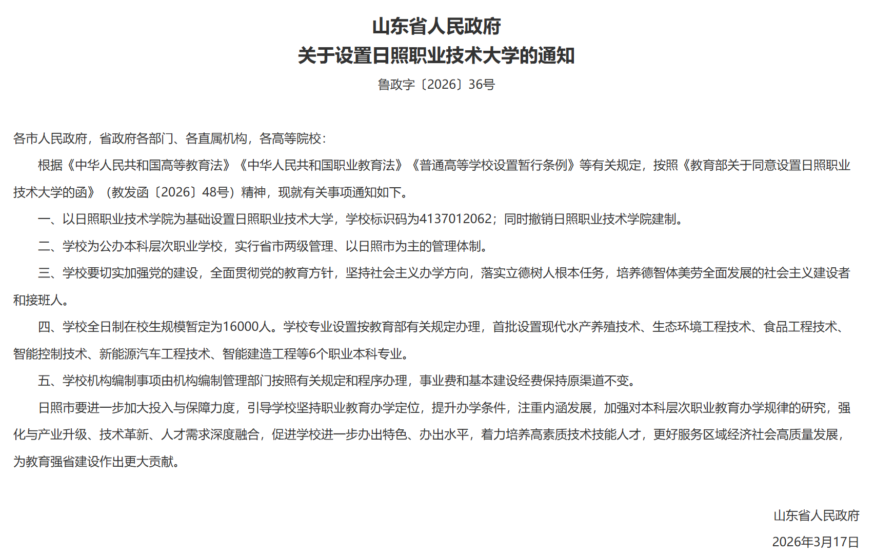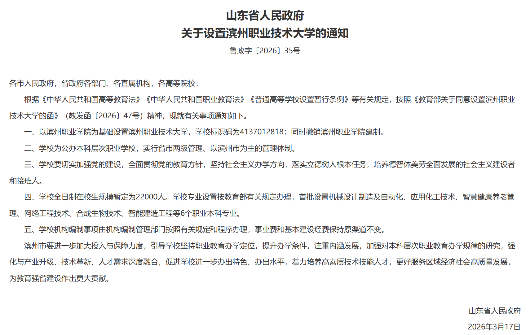 3月18日,山东省人民政府公开发布鲁政字〔2026〕35号、36号文件,批复同意以滨州职业学院为基础设置滨州职业技术大学,以日照职业技术学院为基础设置日照职业技术大学。