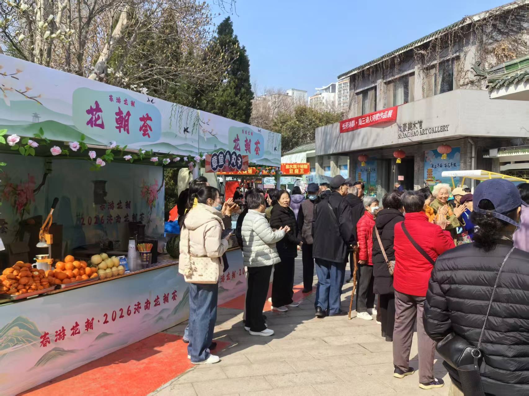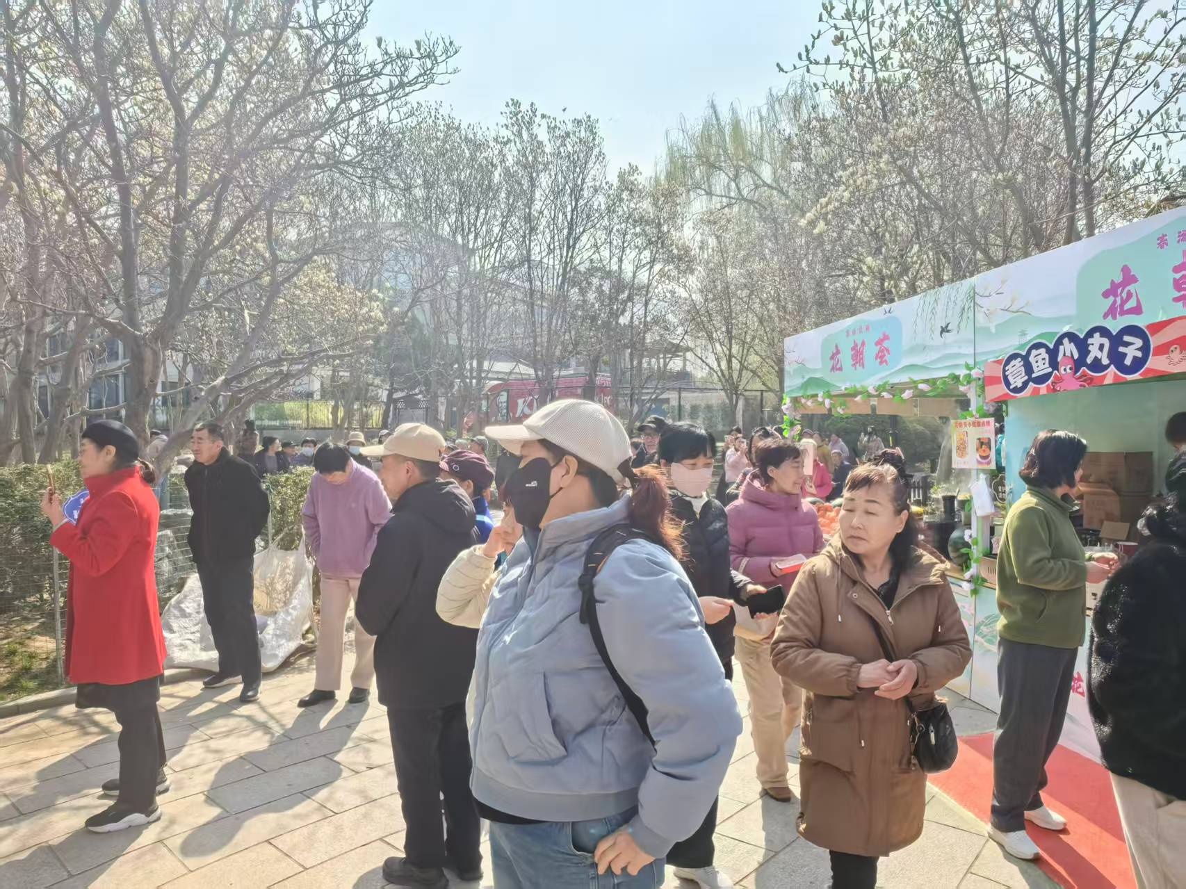 从蘑菇亭西行重返玉兰大道后,这里是公园内市集最密集的区域——“花朝荟市集”主场地,花朝市集总共集结了济南及周边地区的特色美食与非遗手工艺品200余种。现做的糖葫芦裹着晶莹的糖衣,咬下时酸甜交织;黄家烤肉外焦里嫩,香气扑鼻;南山蜂蜜色泽金黄,搭配商家自制的花茶,堪称绝配。此外,市集还设有互动体验区,游客可参与其中,沉浸式感受春日雅趣。