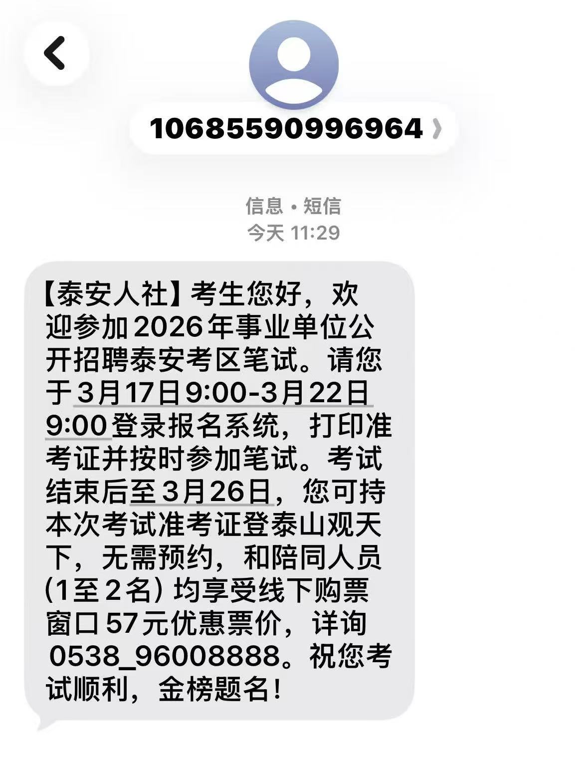 根据考生提供的短信截图显示,信息发布单位是“泰安人社”。短信显示:请考生于3月17日9:00-3月22日9:00登录报名系统,打印准考证并按时参加笔试。