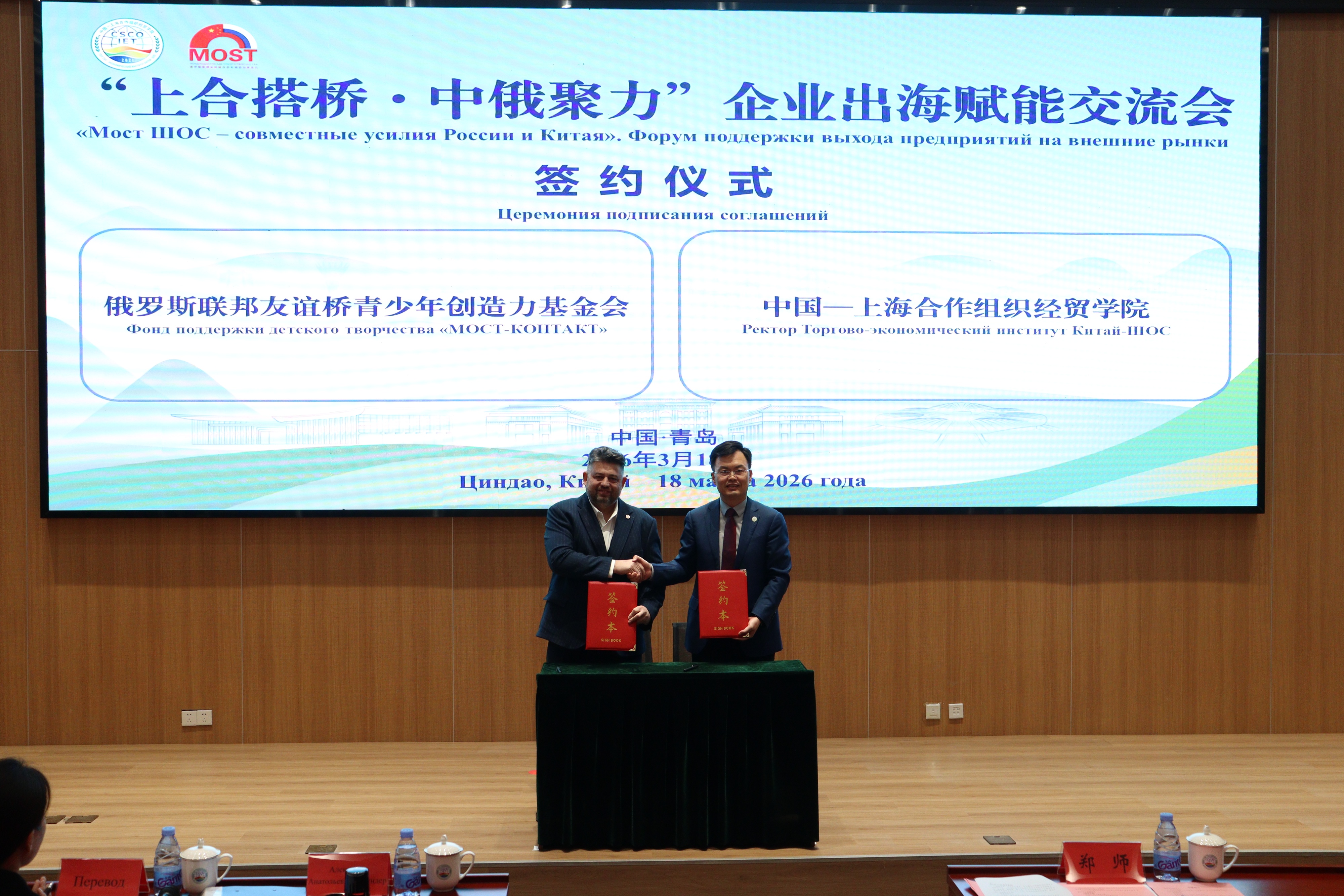 3月18日,“上合搭桥·中俄聚力”企业出海赋能交流会在中国—上海合作组织经贸学院举行。活动中,中国—上海合作组织经贸学院与俄罗斯联邦友谊桥青少年创造力基金会签署合作协议,双方将围绕中国企业家赴俄商务研学、俄罗斯企业家来华交流培训等领域开展深度合作,共同搭建中俄企业资源精准对接平台。