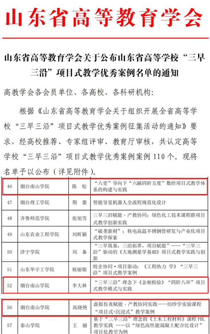 近日,山东省高等教育学会公布山东省高等学校“三早三沿”项目式教学优秀案例评审结果,烟台南山学院推送的三项案例全部入选。智能科学与工程学院陈松老师申报的《“六更”导向下“六融四阶五度”数控项目式教学体系的构建与实践》、李大林老师申报的《“三早三沿”理念下〈金相检验〉“四阶八环”项目式教学模式与实践》,纺织与服装学院高晓艳老师申报的《虚拟仿真赋能·产教协同实践——纺纱学实验课程“项目式+沉浸式”教学案例》分别获评优秀案例。