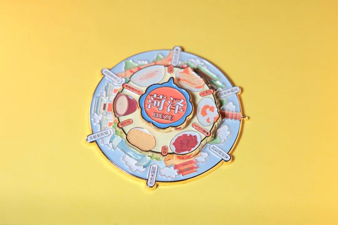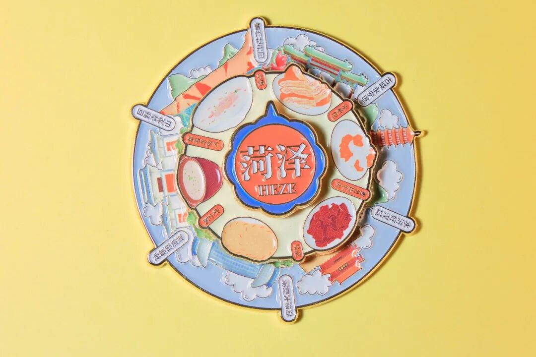 1、菏泽旋转冰箱贴:这款冰箱贴精选菏泽地标建筑、特色美食等极具代表性的城市核心符号作为设计元素。