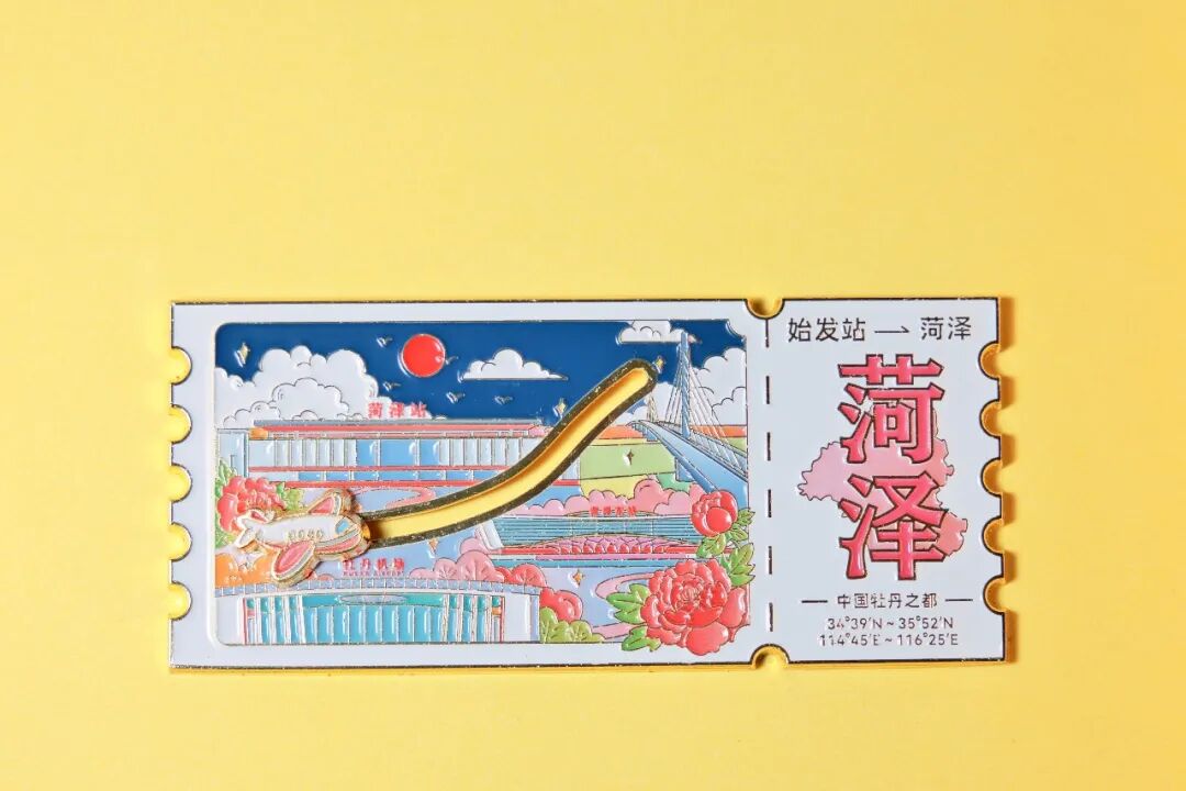 2、菏泽票根冰箱贴:设计上以菏泽城市剪影为基底,巧妙融入飞机场、车站等交通地标元素,采用复古车票的经典版式打造,整体文艺氛围感与纪念感直接拉满。