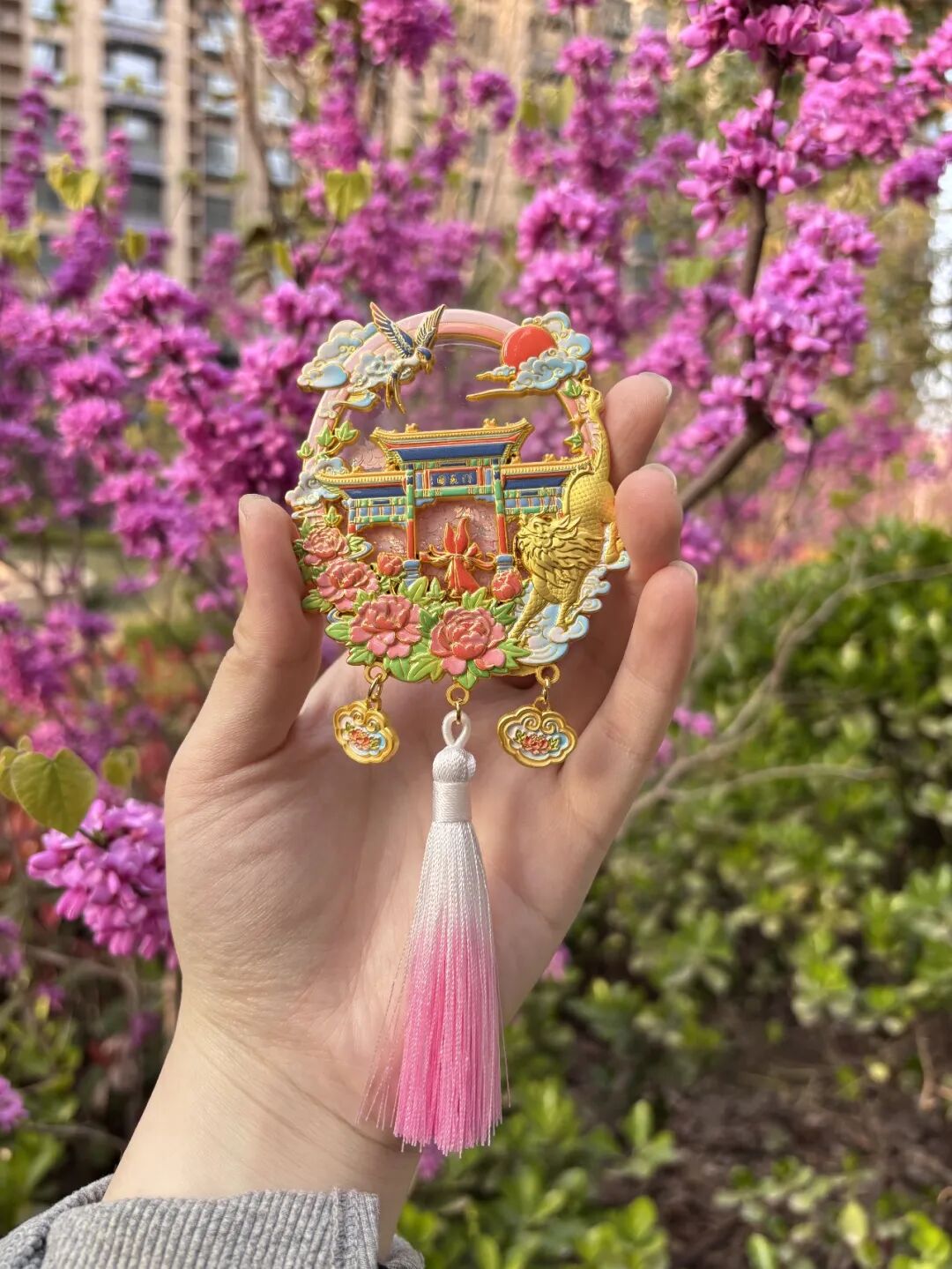 产品采用锌合金镀金搭配珐琅填色工艺,线条清晰利落、色彩饱满鲜亮,耐磨耐用且不易褪色,整体质感厚重高级。它以忠义楼为原型,深度呼应《水浒传》传承千年的“忠义”精神,是菏泽水浒文化的具象化表达。