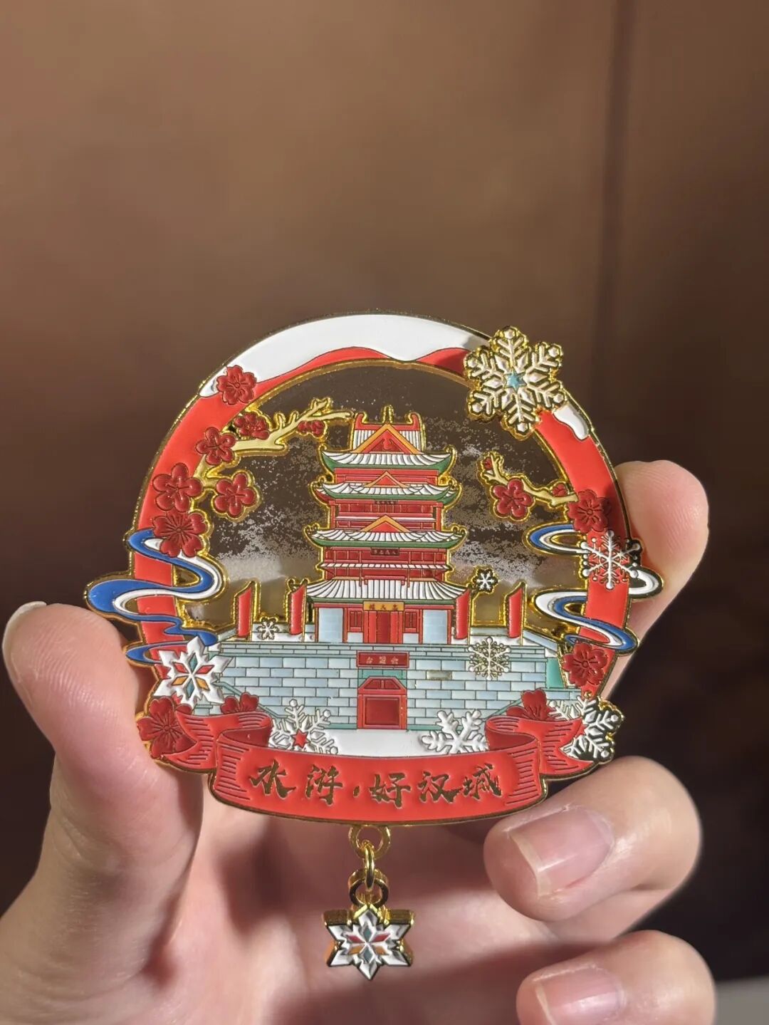 5、水浒好汉城流沙冰箱贴:设计以水浒好汉城核心建筑忠义楼为主体,精准还原北宋楼阁独有的飞檐翘角、斗拱木构,每一处细节都打磨得精致细腻,整体层次分明;同时融入红梅、雪花、飘带等氛围感元素,营造出“雪落古楼、梅开忠义”的唯美冬日意境,经典红金配色大气喜庆,辨识度拉满。