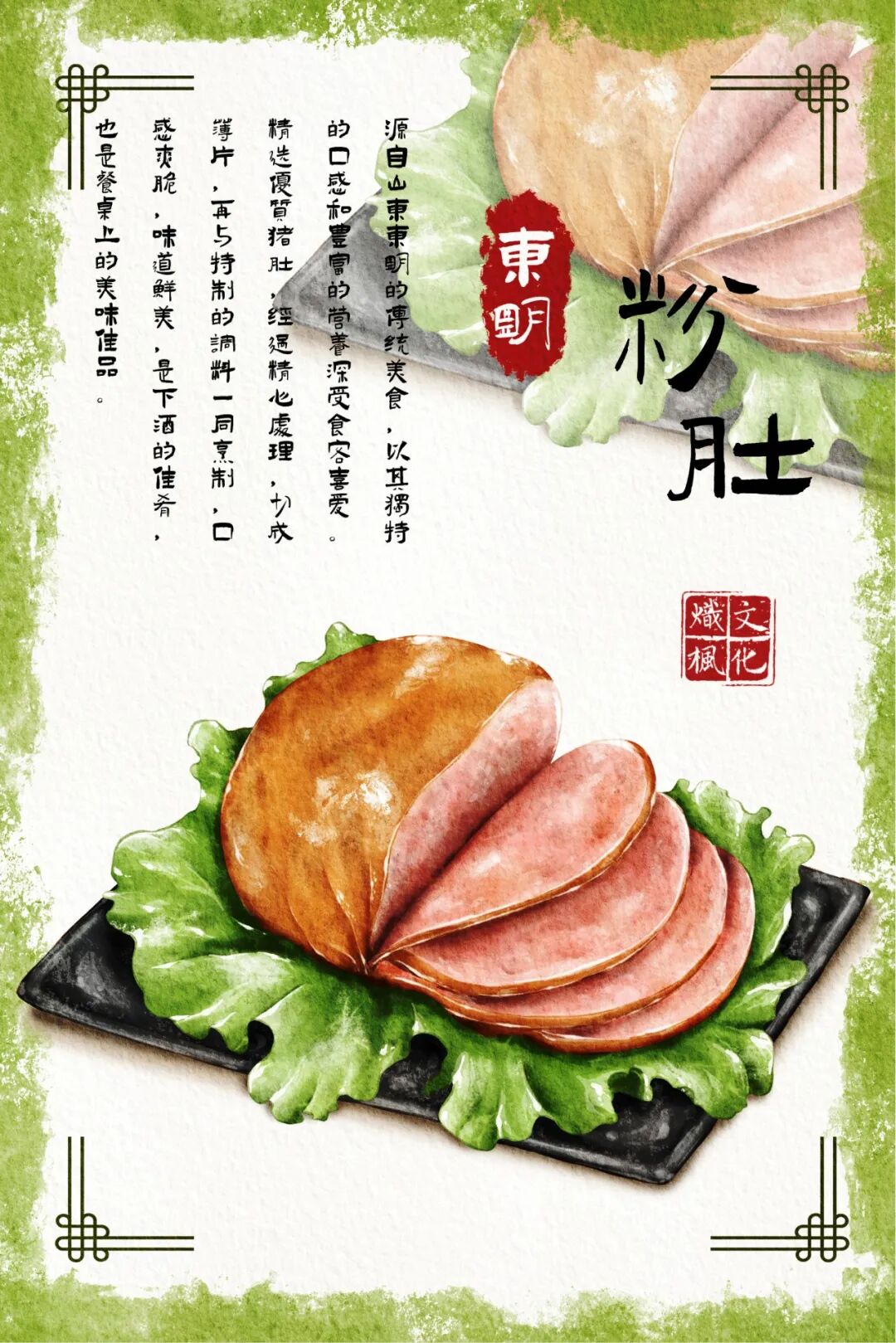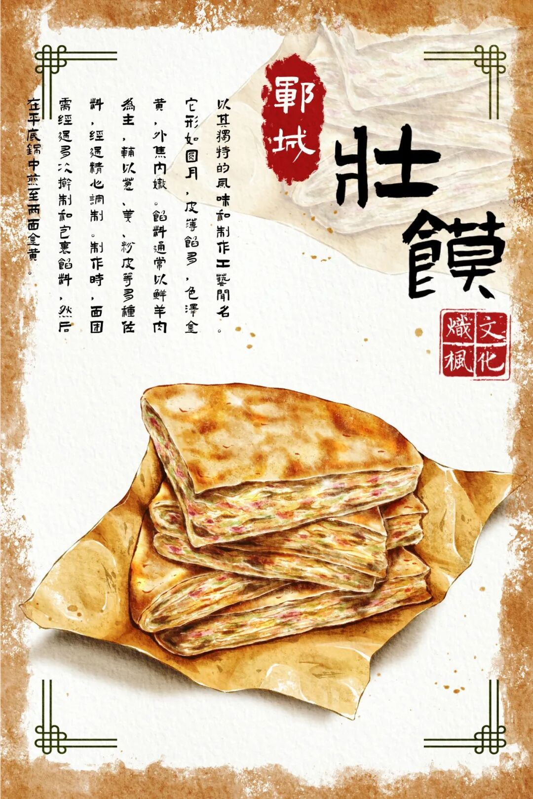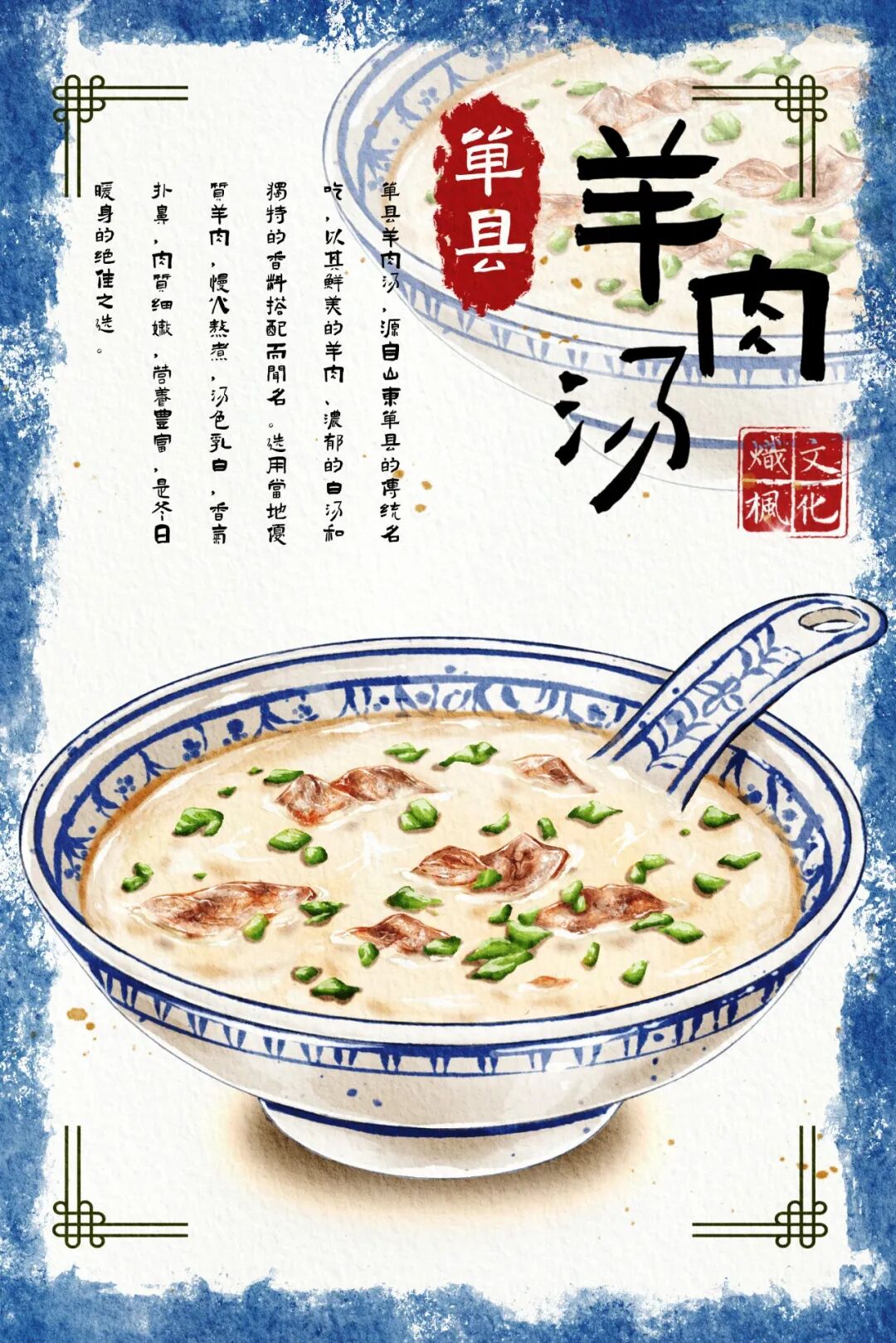 8、菏泽美食系列明信片:设计聚焦菏泽地道特色美食,选取单县羊肉汤、郓城壮馍、东明粉肚等家喻户晓的地方美食元素,用细腻笔触还原菏泽烟火气十足的美食文化,画面精致生动,尽显菏泽本土风味。