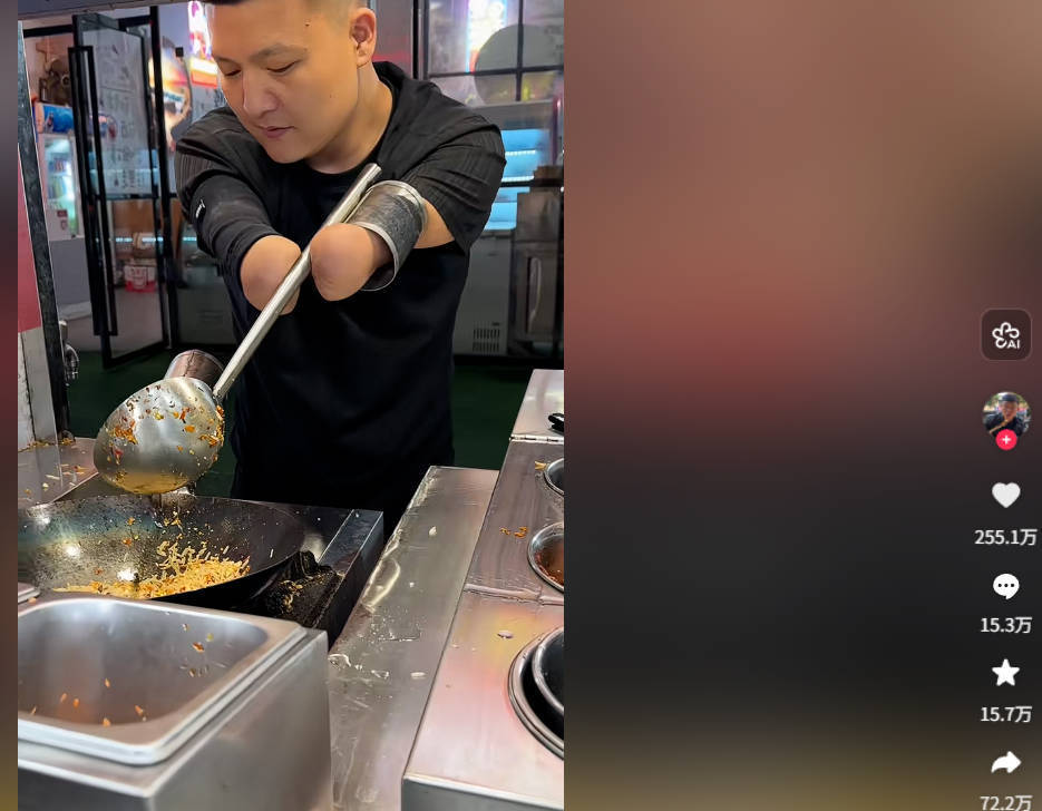 “我的情况很难去外面找工作,只能自己创业,自己当老板。2023年,当时就是抱着去尝试一下的心态,摆摊炒饭。因为我自己在家里也喜欢下厨,但下厨很累,我就想着改造一下工具,让工具卡到断臂上,让自己可以一边拿着锅,一边拿着勺子。起初有人以为我是为了博流量,但现在我已经坚持了三年多。最开始,手臂上都磨出了水泡,磨破后又磨出了茧子,感觉不到疼了。”