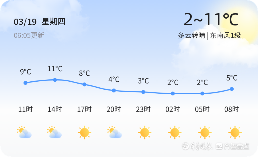 今天是3月19日,星期四,农历二月初一。威海市今日天气多云转晴,气温介于2℃至11℃之间,东南风1级,空气湿度47%。空气质量状况为优(PM2.5指数为30),适宜户外活动。市民出行时建议携带轻便外套,以应对早晚温差。早晨气温较低,市民需注意保暖,防止感冒。预计未来三天,威海市天气以晴到多云为主,气温逐渐回升,最高气温可达15℃,最低气温保持在2℃左右。市民需注意天气变化,及时增减衣物。特别提醒,21日有大风天气,风力可达4-5级,市民出行时请注意防范,避免靠近广告牌等危险区域。温馨提示
