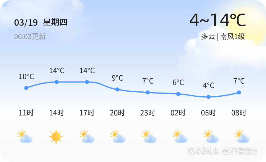 今日是2026年3月19日,星期四,农历二月初一。潍坊市今日天气多云,气温在4℃到14℃之间,南风1级,空气湿度为66%,PM2.5指数为44,属于良好级别。良好的空气质量为市民出行提供了舒适环境。建议市民根据气温变化适时增减衣物,注意保暖。由于今日风力较小,适合户外活动,但早晚温差较大,出行时仍需注意防寒。