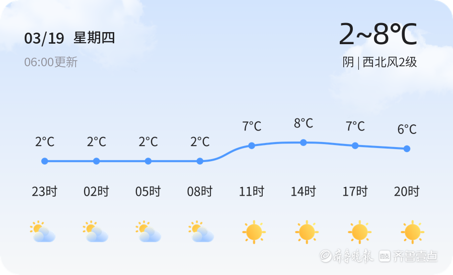 今天是2026年3月19日,星期四,农历二月初一。青岛市今日天气以阴为主,气温在2℃至8℃之间,西北风2级,空气湿度为60%。PM2.5浓度为39,空气质量为良好。今日天气较为阴沉,市民出行时建议携带雨具,注意保暖。由于风力较小,空气质量较好,适合户外活动。