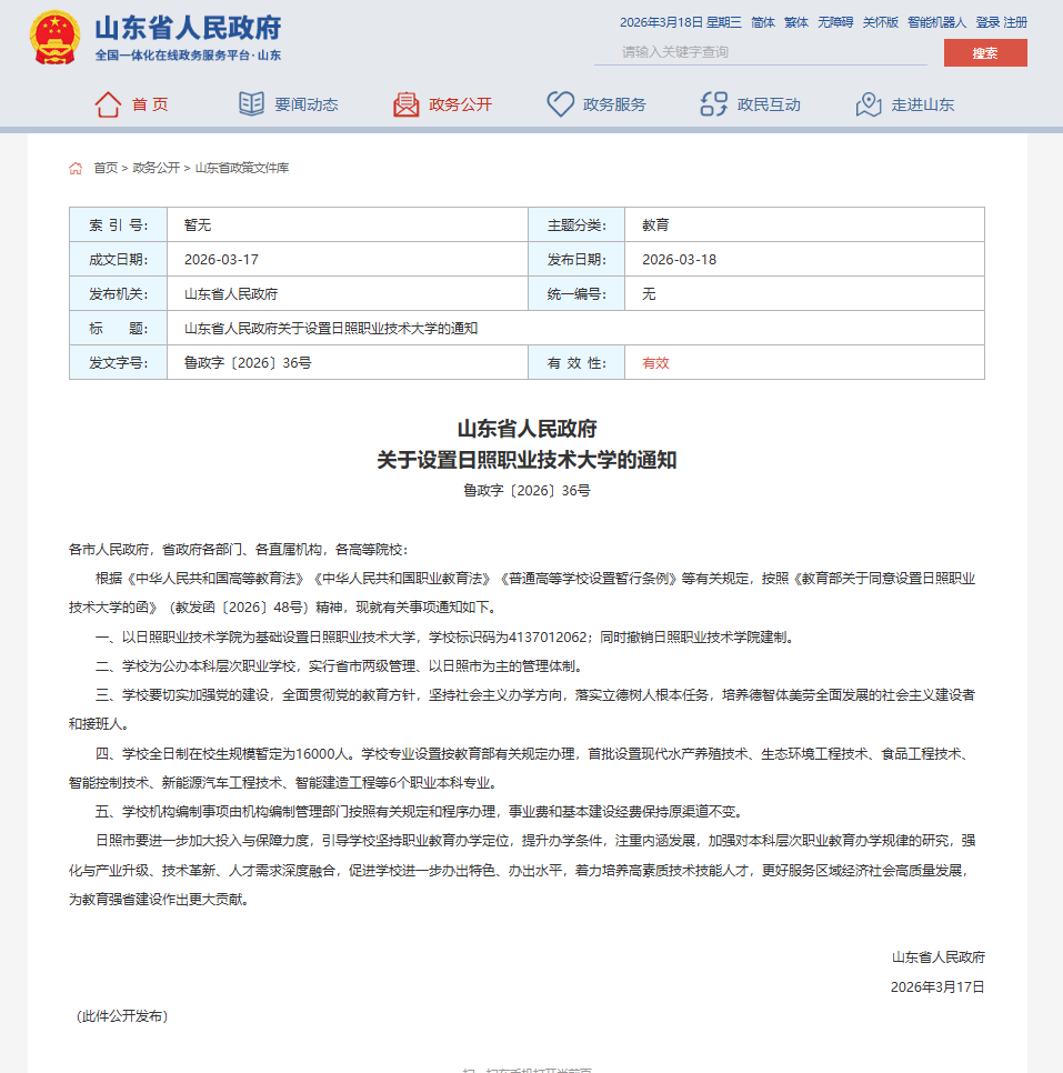 3月17日,按照《教育部关于同意设置日照职业技术大学的函》(教发函〔2026〕48号)精神,山东省人民政府印发《山东省人民政府关于设置日照职业技术大学的通知》(鲁政字〔2026〕36号),以日照职业技术学院为基础设置日照职业技术大学。