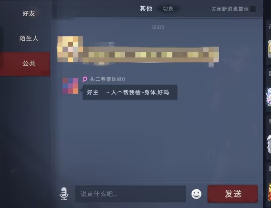 3月17日、18日,极目新闻记者再次查看该游戏发现,此前标记的涉黄账号已被封禁,但公屏中又出现了新的账号发送诱导信息,其中两个账号依旧使用嵌入色情网址的头像,表达方式也更低俗。
